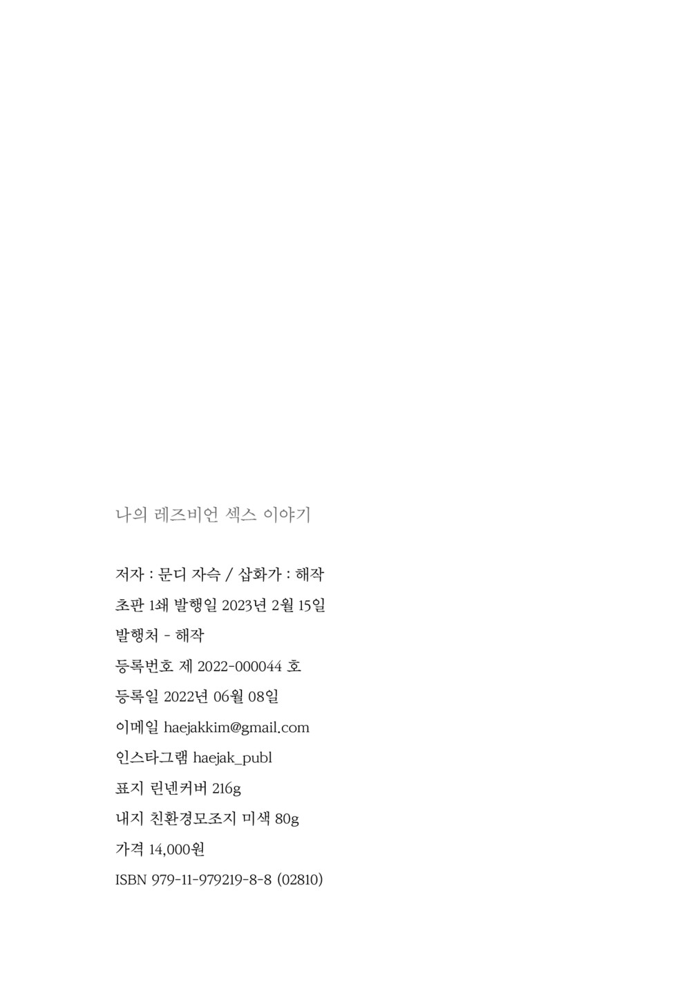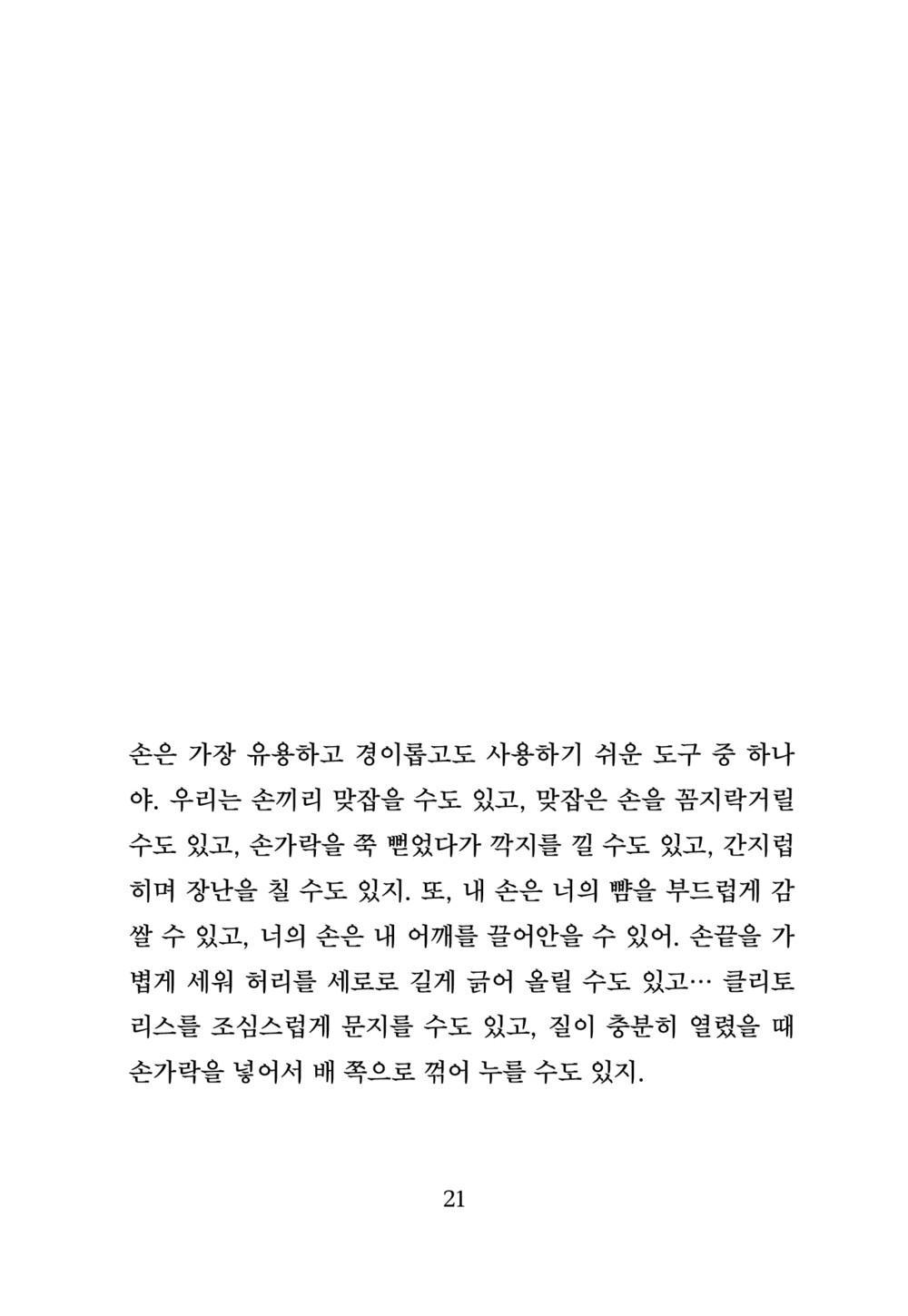 섹스는 그 자체로 기분 좋을 뿐만 아니라, 좋은 섹스는 파트너와의 유대감 강화, 정신적 그리고 육체적 건강 증진, 수면 품질 향상 등의 여러 순기능이 있어. 레즈비언 섹스는 삶을 구성하는 다른 많은 것들과 마찬가지로, 의무도 필수도 아니고 죄악도 아니야. 하지만 그것이 너에게 미지의 영역이라면, 좋은 섹스를 경험해 본 적 없다면, 혹은 궁금하다면, 원한다면, 해 보기를 권해! 그 과정에서 내가 너의 첫 자전거 안장을 잡아 주거나 넘어질 무릎에 약을 발라 주는 건 어렵겠지만, 이 책이 자전거 타는 방법에 대한 책을 읽는 것 정도의 만큼이나마 도움이 되었으면 좋겠다.