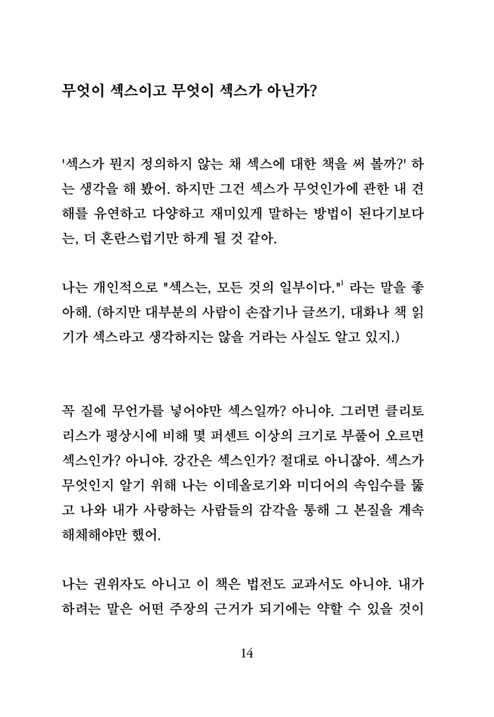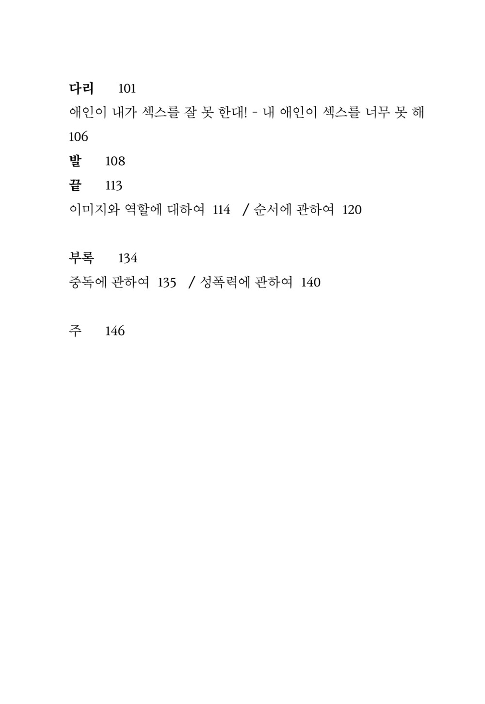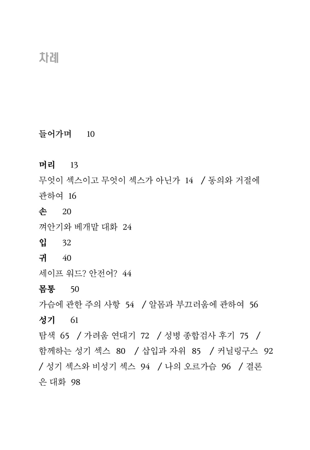 탐색 / 가려움 연대기 / 성병 종합검사 후기 / 함께하는 성기 섹스 / 삽입과 자위 / 커닐링구스 / 성기 섹스와 비성기 섹스 / 나의 오르가슴 / 결론은 대화
