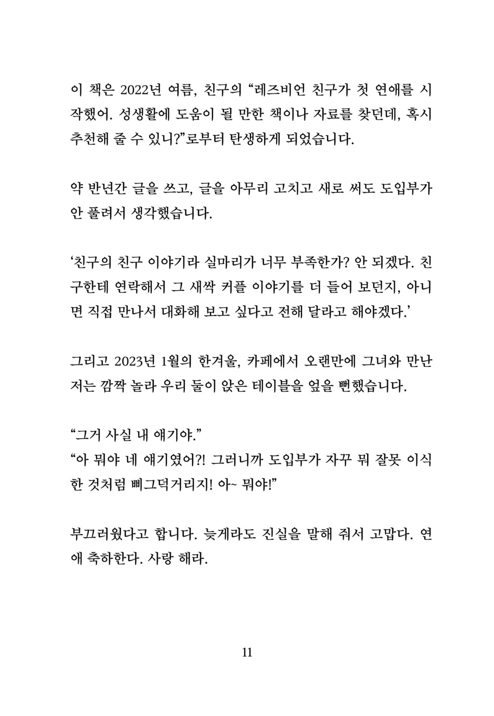 이 책은 친구의 “레즈비언 친구가 첫 연애를 시작했어. 성생활에 도움이 될 만한 책이나 자료를 찾던데, 혹시 추천해 줄 수 있니?” 로부터 탄생하게 되었습니다.