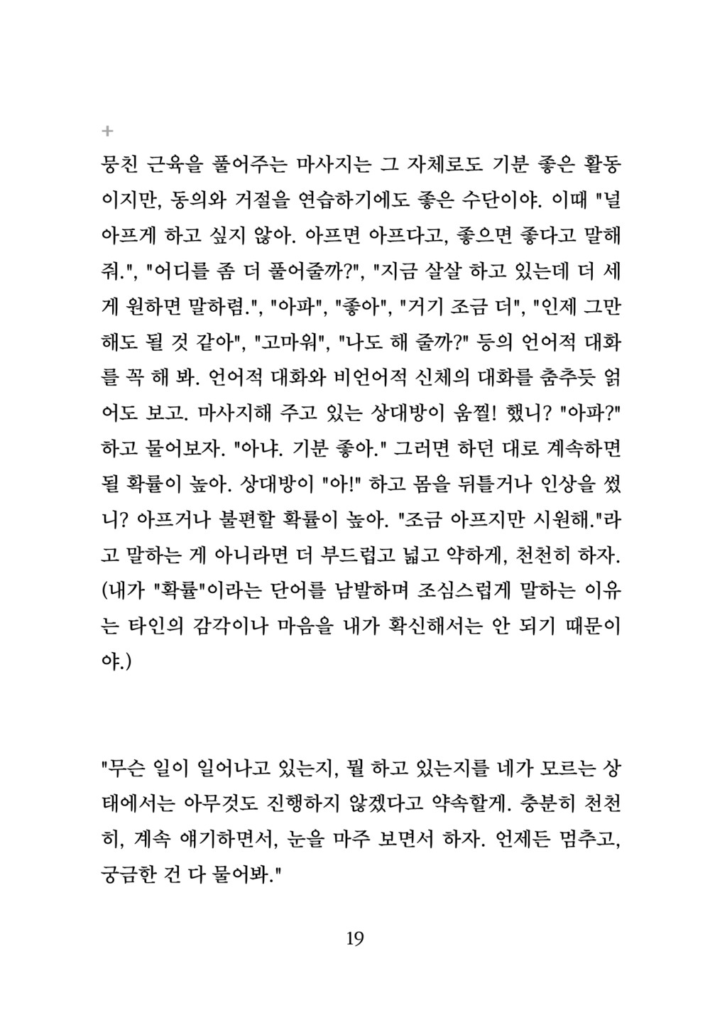 "무슨 일이 일어나고 있는지, 뭘 하고 있는지 네가 모르는 상태에서는 아무것도 진행하지 않겠다고 약속할게. 충분히 천천히, 계속 얘기하면서, 눈을 마주 보면서 하자. 언제든 멈추고, 궁금한 건 다 물어봐."