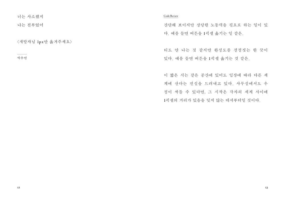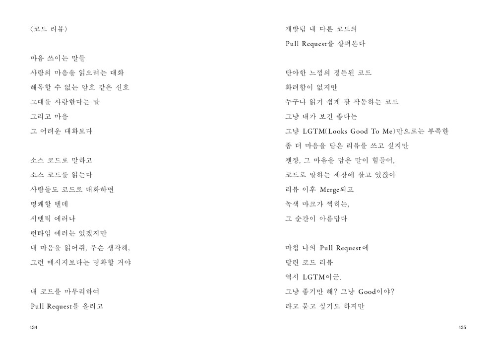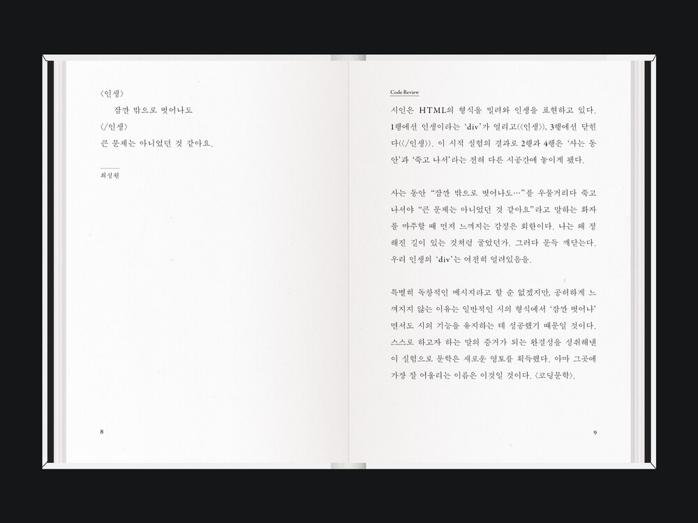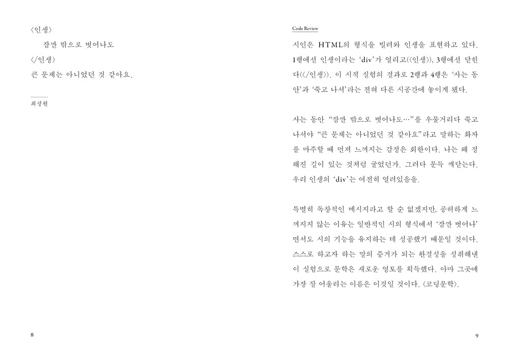 특별히 독창적인 메시지라고 할 순 없겠지만, 공허하게 느껴지지 않는 이유는 일반적인 시의 형식에서 ‘잠깐 벗어나’면서도 시의 기능을 유지하는 데 성공했기 때문일 것이다. 스스로 하고자 하는 말의 증거가 되는 완결성을 성취해 낸 이 실험으로 문학은 새로운 영토를 획득했다. 아마 그곳에 가장 잘 어울리는 이름은 이것일 것이다. <코딩문학>