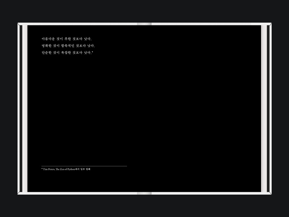 “세상의 모든 것들은 변해요. 심지어 사람은 6년 뒤면 세포 하나까지도 같은 점이 없다고 해요. 테세우스의 배 같은 거죠. 그래서 전 알고리즘이 좋아요. 어떤 상황에도 흔들리지 않는 완전무결한 시스템을 내 손으로 만들어내는 거니까요. 민영 씨는 어떠세요?”