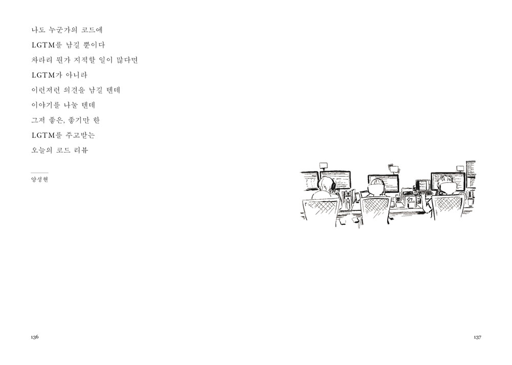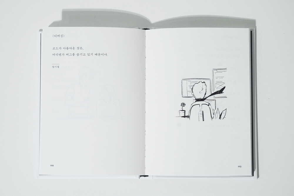 <코딩문학>은 코딩문학제 출품작 중 73편의 작품들에 짧은 평론과 삽화를 덧붙여 엮은 시집입니다.아름다운 책에 담긴 개발자식 농담을 즐겨보세요. <코딩문학>을 통해 디지털과 아날로그, 온라인과 오프라인, 문과와 이과 사이 어디쯤에서 즐거움을 발견할 수 있길 바랍니다.