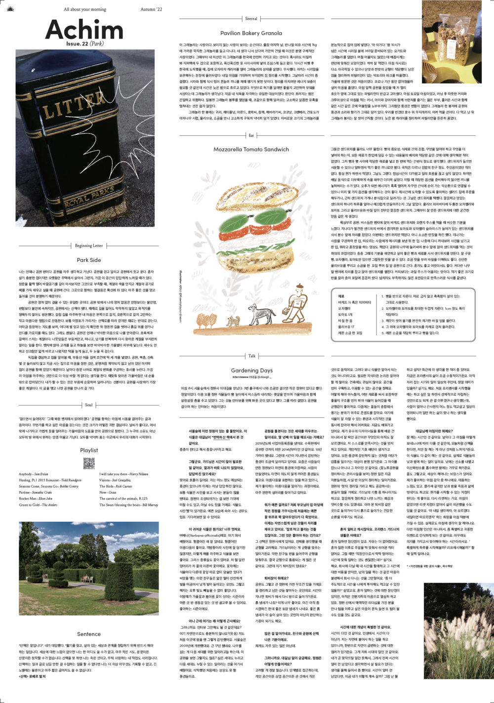 Achim은 한글 발음 그대로 ‘아침(Morning)’을 의미합니다. 오늘을 사는 우리 모두는 해가 뜨고 지는 것을 경험합니다. 푸르거나 붉은 하루의 시작. 고요와 적막이 선물한 몰입의 한가운데서 하루를 시작할 용기를 얻고 차근히 움직입니다. 매거진 Achim에는 오직 내게만 집중하는 아침을 보내며 남겨진 영감을 담아냅니다.