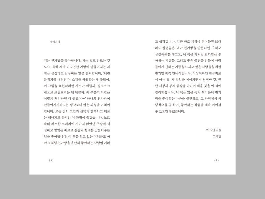 천가방 제작자로 활동하는 저자가 원단 시장과 봉제 공장을 다니며 경험한 것과 천가방 제작에 필요한 정보를 정리한 실무 안내서입니다.