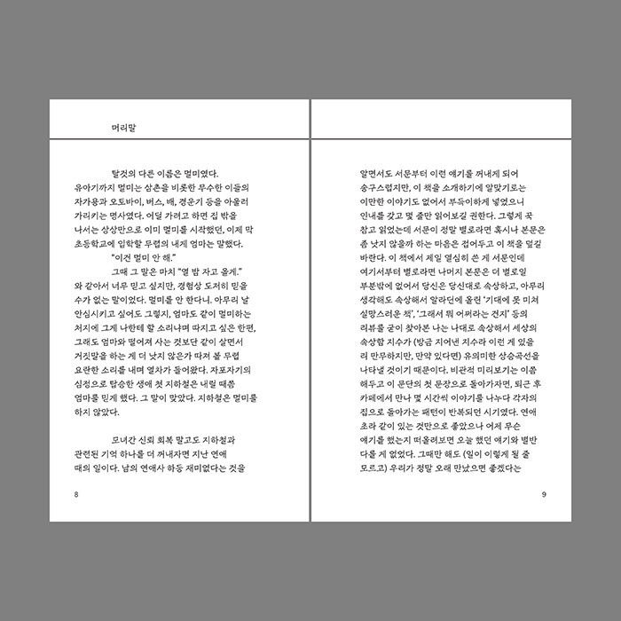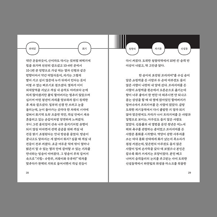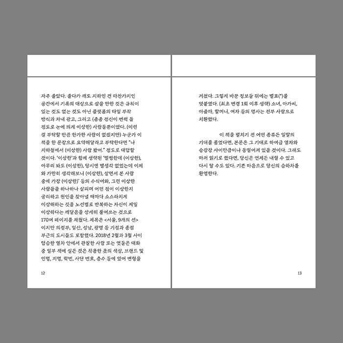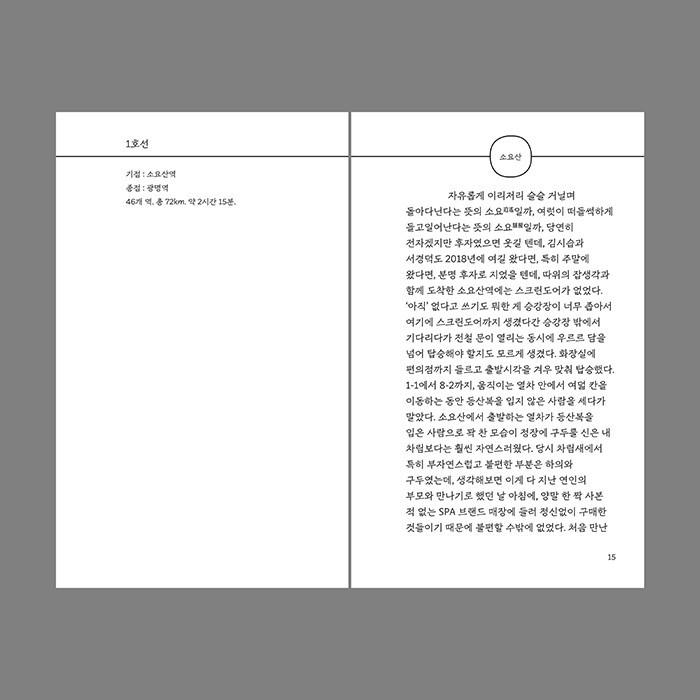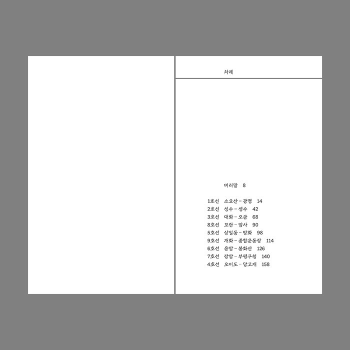 모험과 도전 없이 정해진 길을 지나는 오락의 기록이자, 기점에서 종점까지 관찰한 것들을 얼마나 빠짐없이 수집할 수 있는가에 대한 실험의 보고입니다. 지하철이 오가는 곳으로 '도시, 선'은 이어집니다.