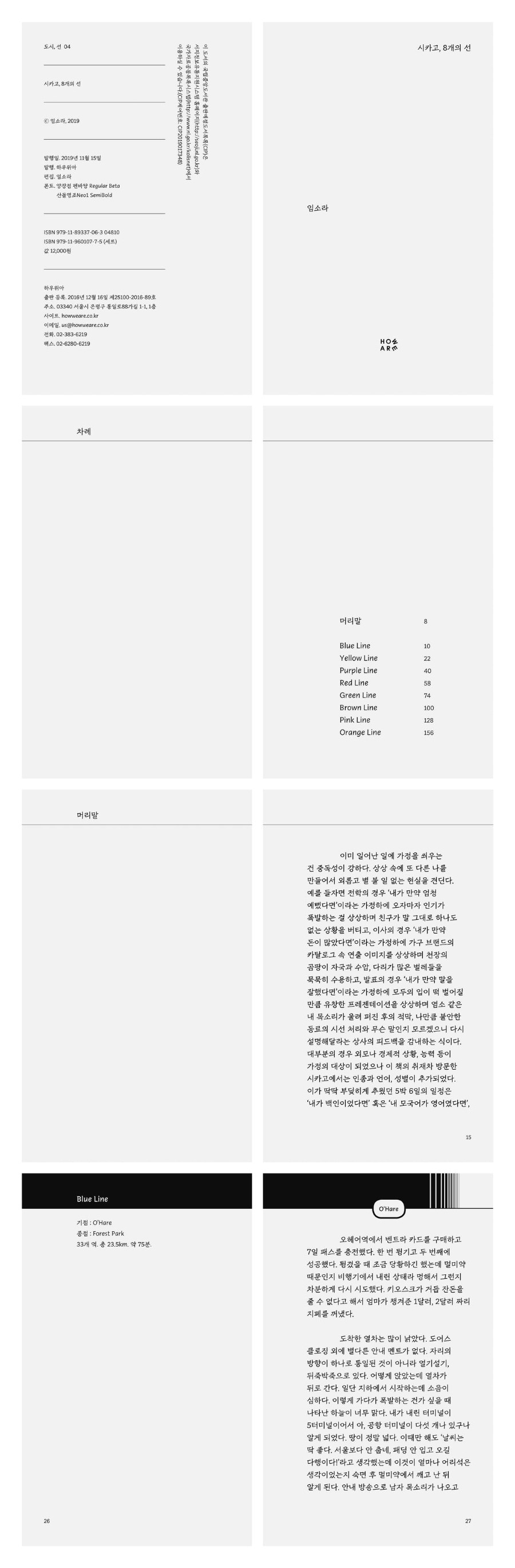 1호 <서울, 9개의 선>, 2호 <홍콩, 11개의 선>, 3호 <도쿄, 13개의 선>을 잇는 '도시, 선' 시리즈 4호 <시카고, 8개의 선>은 시카고의 지하철 탑승기입니다. 2019년 3월, 시카고를 안팎을 오가는 8개의 노선 (Blue Line, Brown Line, Green Line, Orange Line, Pink Line, Purple Line, Red Line, Yellow Line) 안에서 보고 느낀 바를 담았습니다.