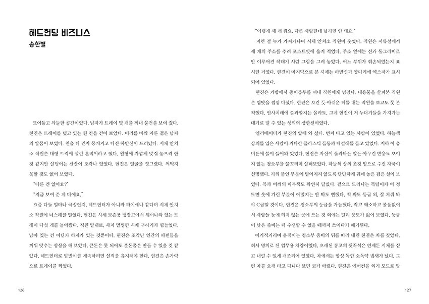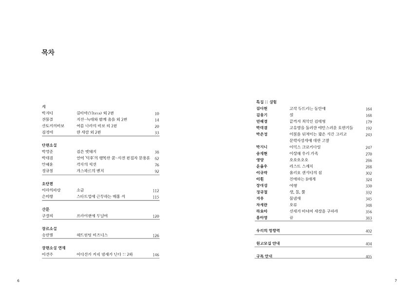 여덟 명의 소설가가 쓴 단편소설 네 편 / 초단편소설 두 편 / 장르소설 한 편 / 장편연재소설 한 편,