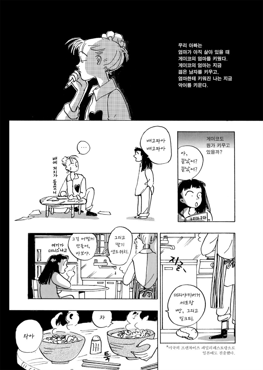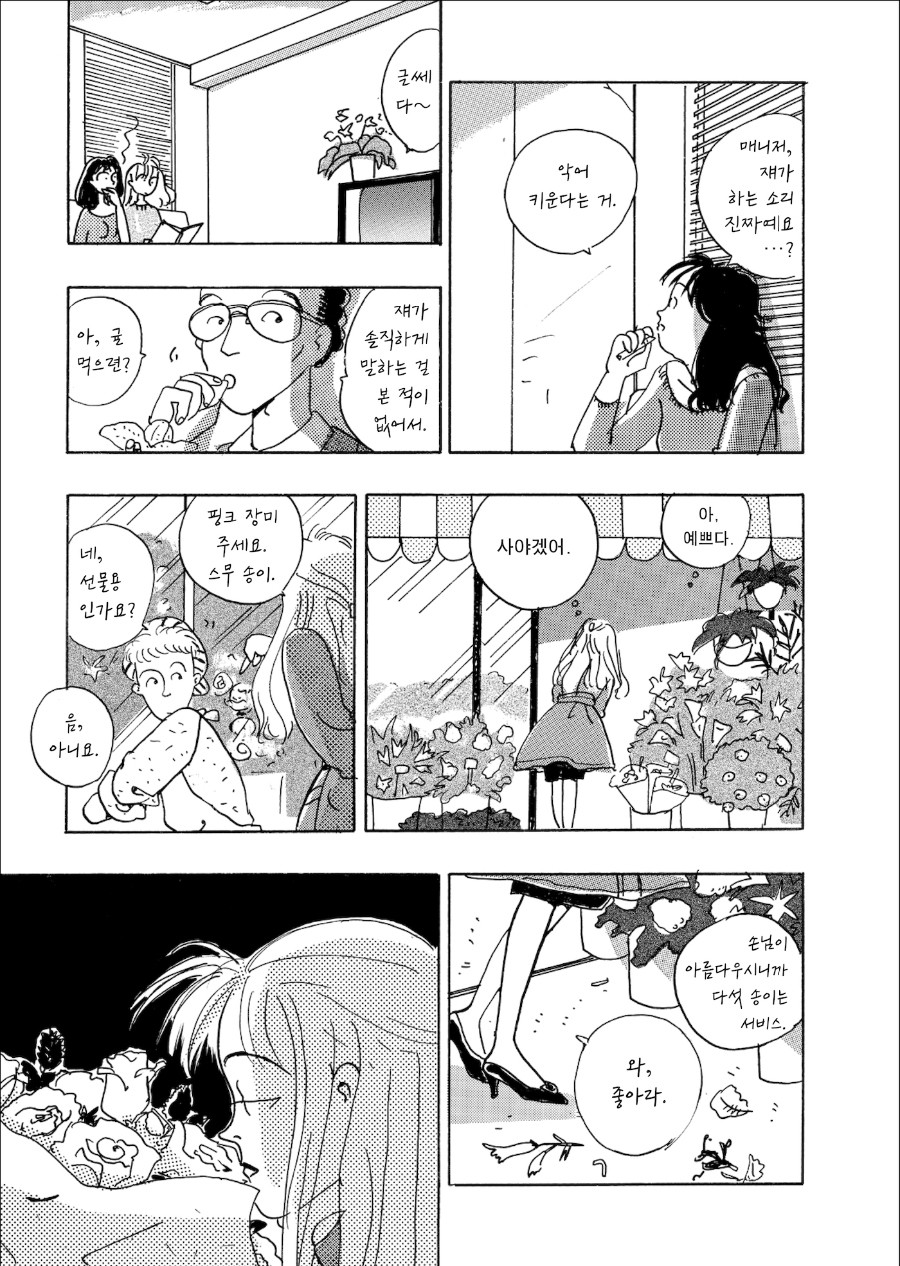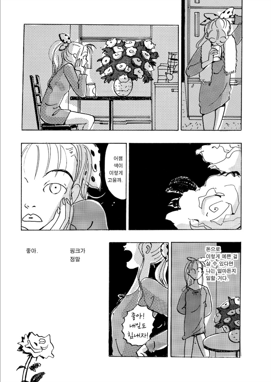 『핑크』에는 기르는 자와 길러지는 자가 앞다투어 등장합니다. 그중에는 꿈을 키우는 사람도 있고 현실이 제대로 키워지지 않아 그 꿈을 조금은 그릇된 방식으로 오려서 달성하는 사람도 있습니다. 어쩌면 억지로 오려낸 조각으로 우리는 하루하루 무사히 길러지는지도 모른다는 사실을, 이 만화는 쿡쿡 찌르듯 가르쳐줍니다.