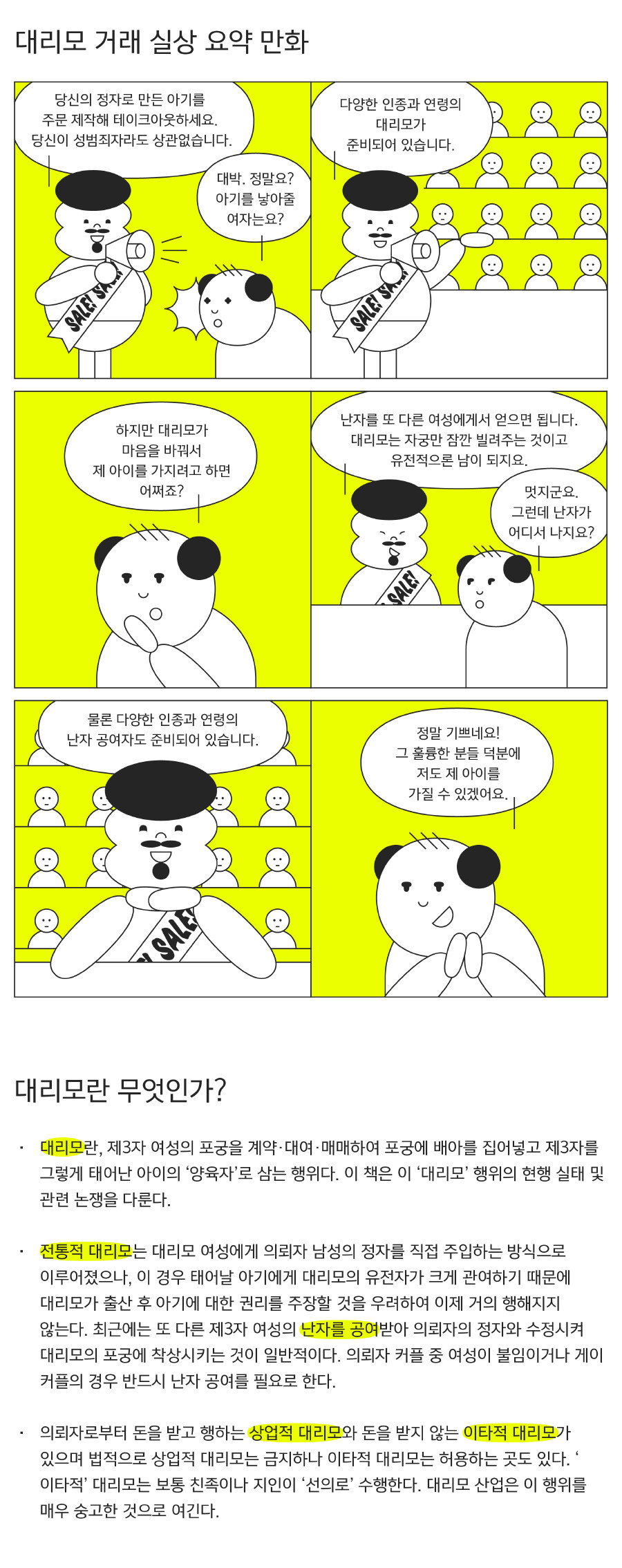 앞의 두 질문에 대한 답에서도 알 수 있듯 대리모는 평등한 세계에서 온전한 권리와 경제력을 가진 여성 개인이 행하는 ‘능동적 선택’이 아니며 이들은 제대로 된 의료 정보조차 얻지 못하고 이 일을 수행하게 된다. 대리모 아기를 의뢰한 호주인 부부가 태어난 쌍둥이 가미와 피파 중 장애가 없는 피파만을 데리고 본국으로 돌아가 한 아기가 버려진 일이나, 중국에서 ‘아들이 없는 것이 한’이라는 고위급 인사에게 뇌물로 대리모 아기를 만들어 바친 이야기를 ‘극히 일부 사례’라 치부해 버리기엔 대리모 거래를 둘러싼 어두운 이야기들은 지나치게 생생하고 다양하다.