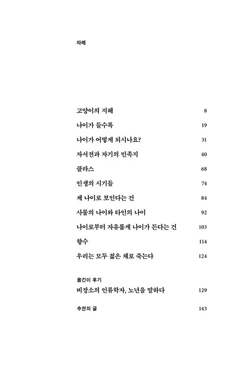 이 책에서 저자는 원래 타문화를 연구하는 인류학자의 실천 결과물을 뜻하는 ‘민족지’의 기법을 나이 들어가는 ‘자기’에게 적용합니다. 어쩌면 이 책의 진정한 매력은 단지 노년을탐구하고 그로부터 적극적 가치를 이끌어 내는 데 중심을 두지 않고 ‘나이 듦’을 낯설게 봄으로써 우리가 묻지 않아 온 시간과 나이, 자아의 관계를 마주할 수 있게 해 주는 데 있다고 해야 할 듯도 합니다. 또한 저자의 풍부한 교양을 바탕으로 한 사색은 책읽기 본연의 즐거움을 일깨워 줍니다.