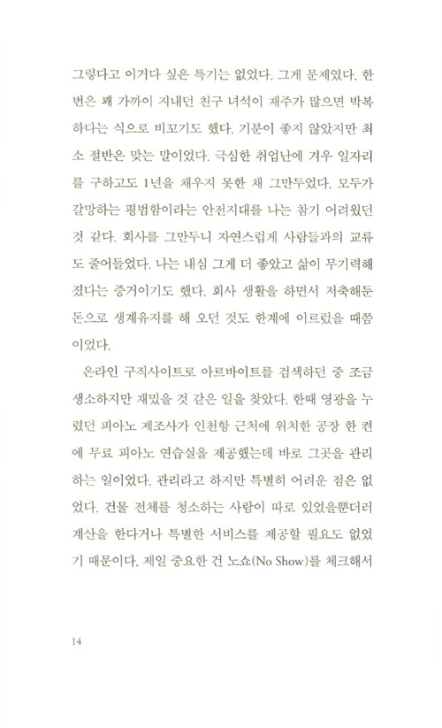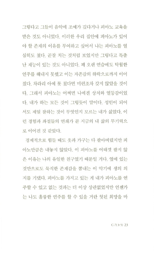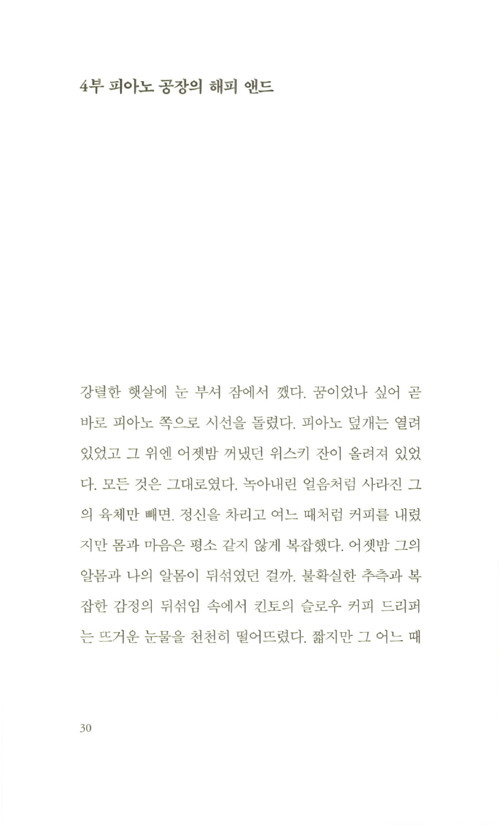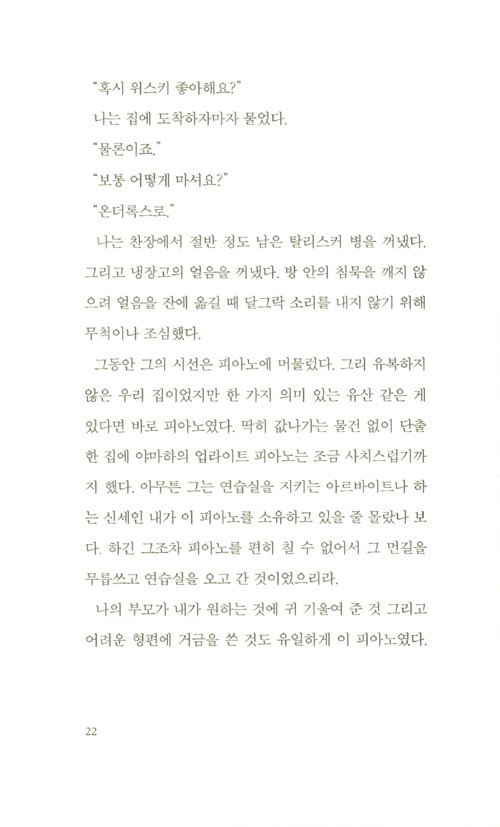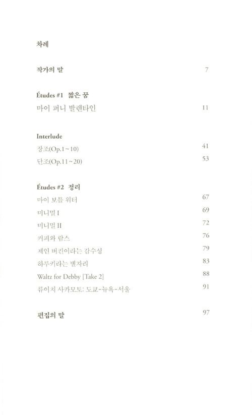 작가는 자신의 악보 위에 적혔던 사랑과 음악을 되돌아보고 그것을 글자로 바꿔 다시 연주합니다. 음악의 음률과 즉흥, 순간과 영원, 단조나 장조의 오르내림을 삶의 자국으로 기어이 기록해 낸 <사랑의 에튀드>는 그렇게 사랑과 사람, 음악과 글의 변주를 통해 흐르는 감각과 흘리는 독서의 경험을 선사합니다.