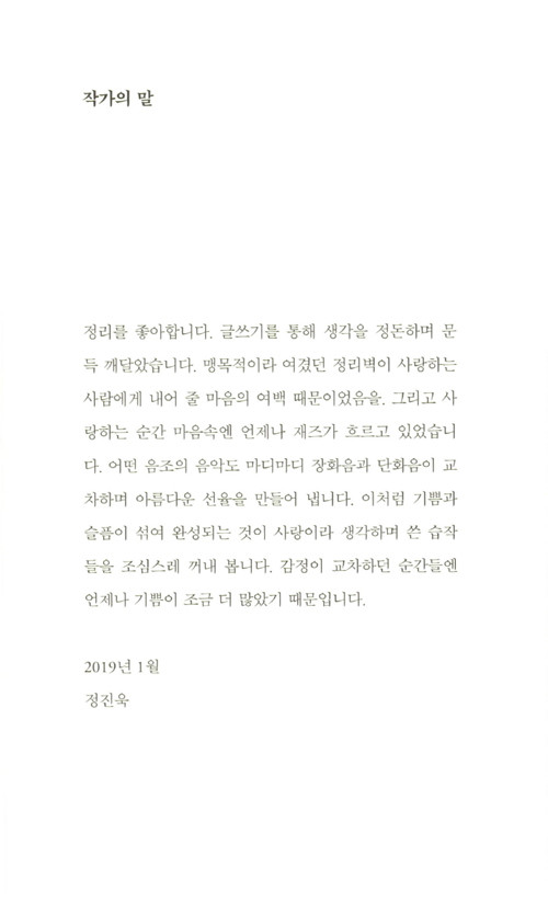 2부 ‘정리’는 작가가 집착에 가까울 정도로 반복했던 정리라는 행위가 사랑하는 사람에게 내어줄 마음의 여백 때문이었음을 깨닫게 해 준 에세이들로 엮였습니다.