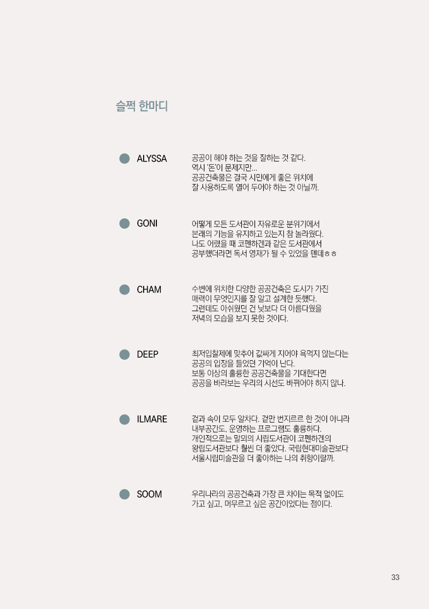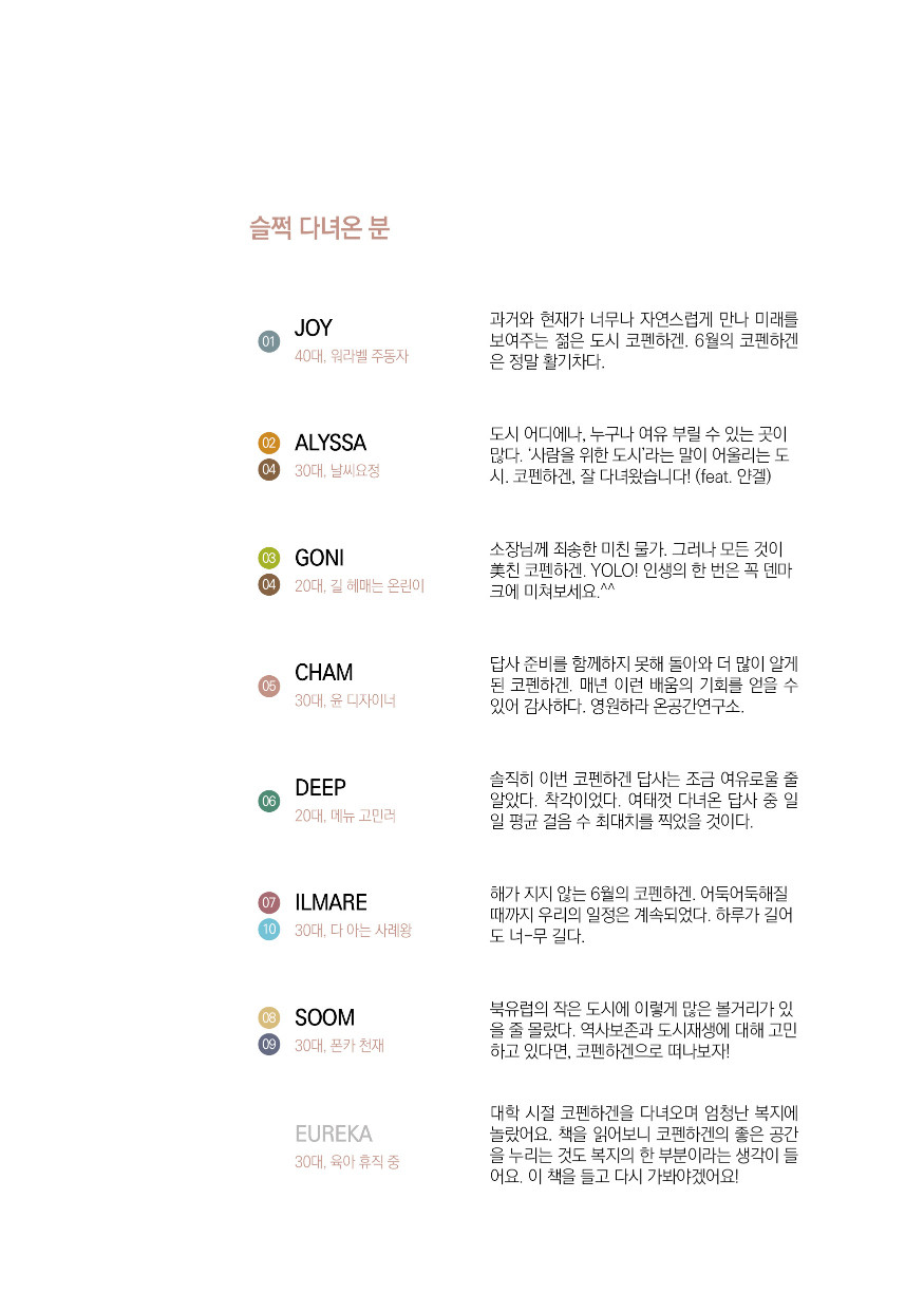 <우리가 슬쩍 본 도시> 시리즈는 도시를 공부하고, 계획하는 사람들이 여행자의 시선으로 도시를 둘러보고 느낀 단편적 인상에 대한 기록입니다. 올해는 ‘행복지수 1위 휘게의 나라, 살기 좋은 도시’로 얘기되는 덴마크 코펜하겐에 다녀왔습니다. 일주일의 짧은 기간이지만, 20대에서 40대까지 여러모로 다른 7명의 시선이 한꺼번에 담겨있다는 점에서 의미를 찾을 수 있을 것입니다.