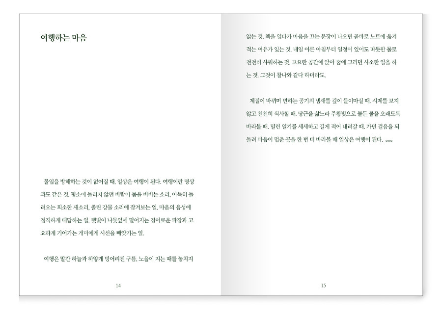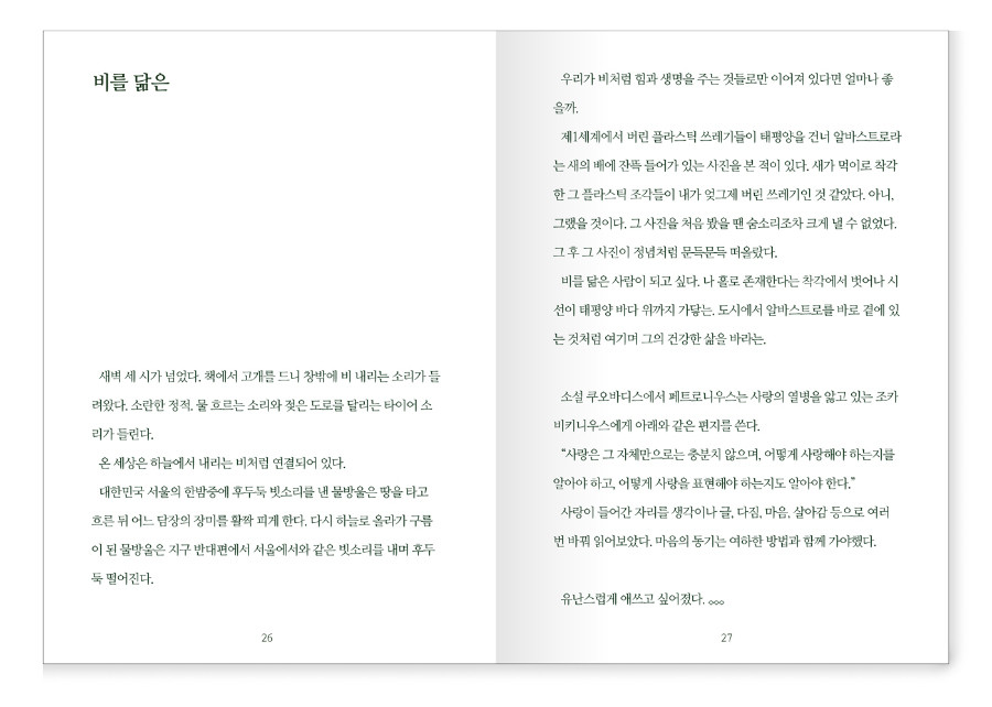 뭔가, 라는 말 / 여행하는 마음 / 무엇이 되지 않기 / 비를 닮은 / 삶과 글 / 알아가는 것 / 나무의 계절 / 노을이 하는 말 / 당신의 예정은 무엇인가요 / 사랑받은 경험에 대해서 / 나는 완성되지 않았어 / 글을 쓴다는 것 / 속사람 / 이해