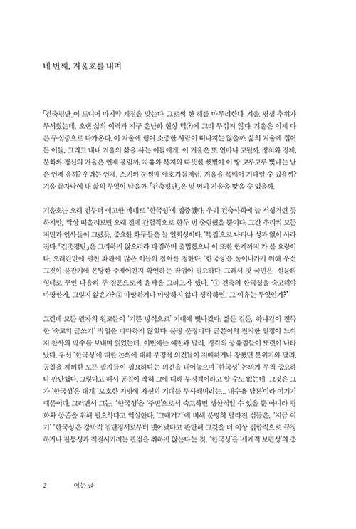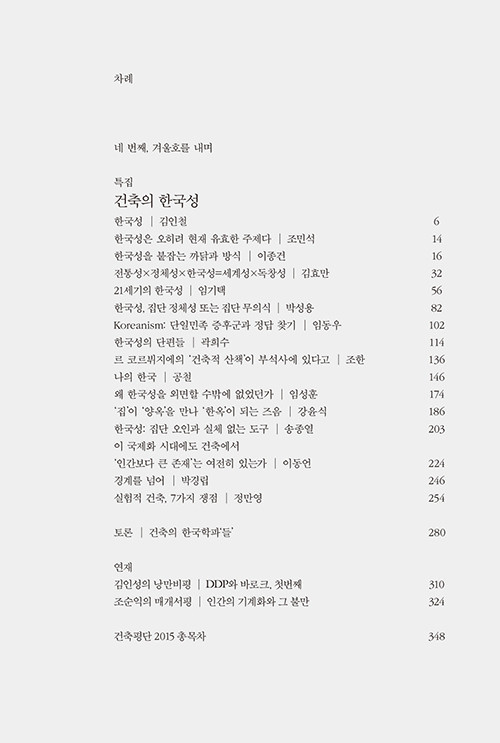 겨울호는 오래 전부터 예고한 바대로 ‘한국성’에 집중했다. 우리 건축사회에 늘 서성거린 듯하지만, 막상 떠올려보면 오래 전에 간헐적으로 한두 번 출현했을 뿐이다. 그간 우리의 모든 지면과 언사들이 그랬듯, 중요한 화두들은 늘 일회성이다. ‘특집’으로 나타나 성과 없이 사라진다. 「건축평단」은 그리하지 않으리라 다짐하며 출범했으니 이 또한 한계까지 가 볼 요량이다. 오래간만에 펼친 좌판에 많은 이들의 참여를 청한다. ‘한국성’을 풀어나가기 위해 우선 그것이 붙잡기에 온당한 주제어인지 확인하는 작업이 필요하다.