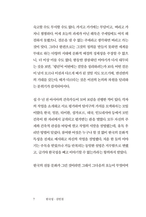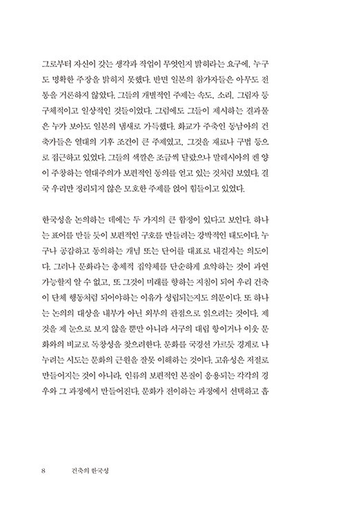 그래서 첫 국면은, 설문의 형태로 꾸민 다음의 두 질문으로써 윤곽을 그리고자 했다. “① 건축의 한국성을 숙고해야 마땅한가, 그렇지 않은가? ② 마땅하거나 마땅하지 않다 생각하면, 그 이유는 무엇인가?”