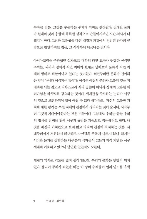 ‘그때 거기’에 비해 분명히 달라진 점들은, ‘지금 여기’ ‘한국성’은 강박적 집단 정서로부터 벗어났다고 판단해 그것을 더 이상 집합적으로 규정하거나 전통성과 직결시키려는 관점을 취하지 않는다는 것, ‘한국성’을 ‘세계적 보편성’의 층위에서 숙고해야 한다는 것, 그리하는 데 우리 당대의 특성인 동적 정체성과 문화적 혼성성을 적극적으로 수용해야 한다는 것 등이다. 이러한 관점들은 우리가 서구 콤플렉스나 정체성 위기로부터 분명히 벗어났다는 것을 보여준다. 그리고 항차의 ‘한국성’ 논의가 생산적일 수 있을 가능성을 정확히 보여준다.