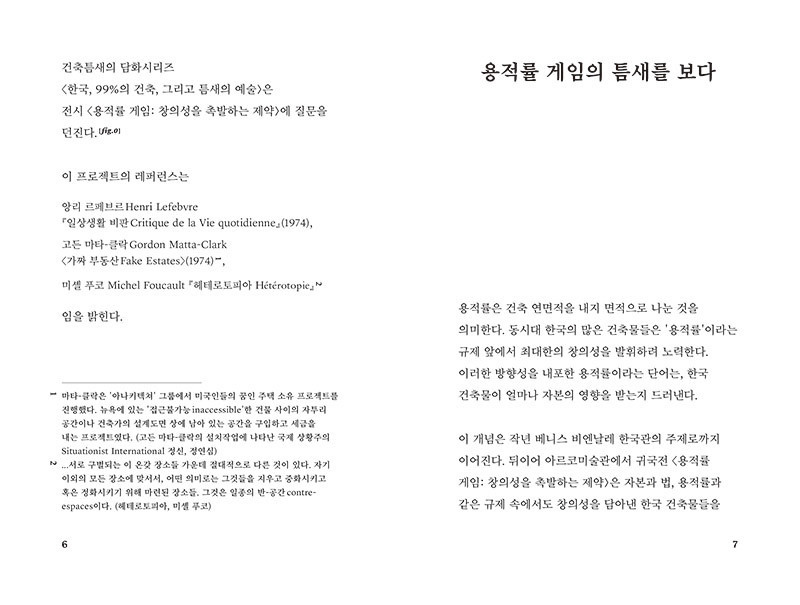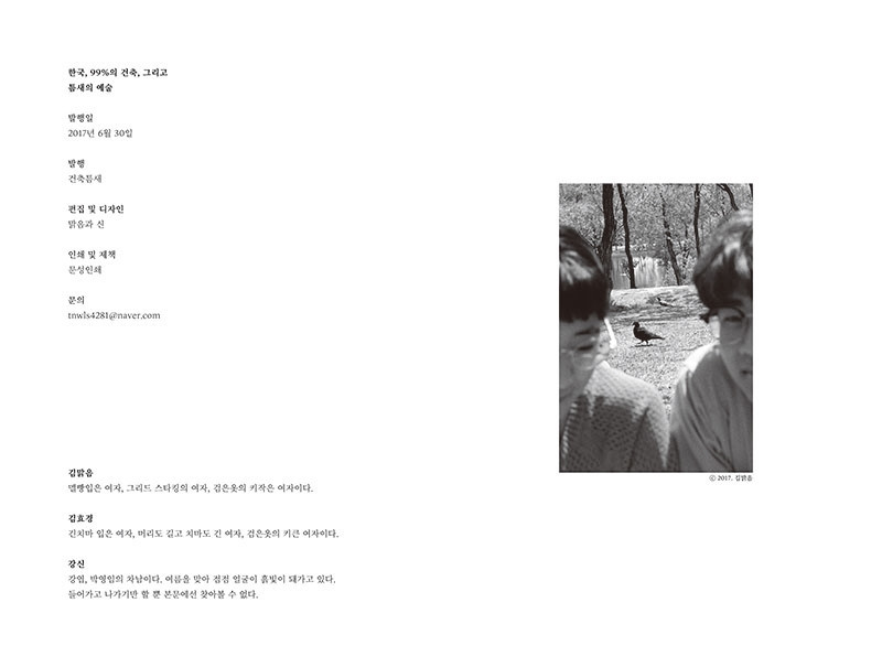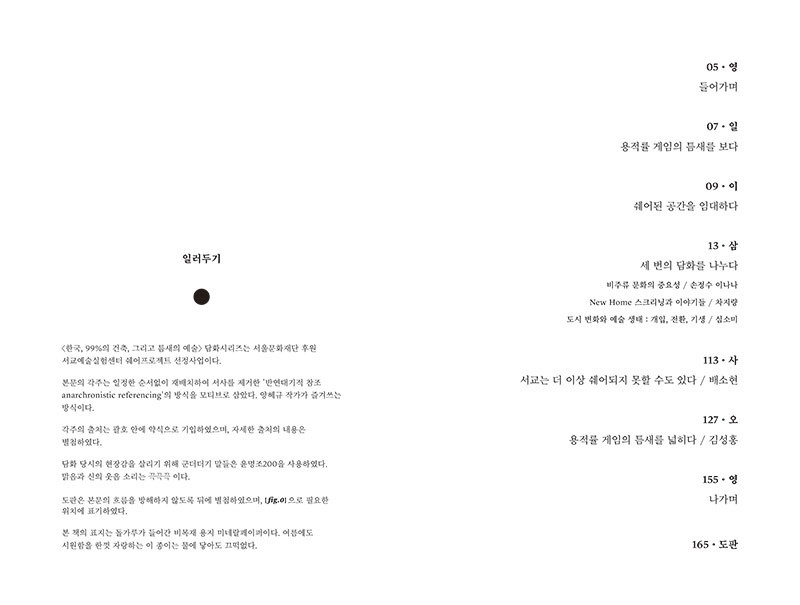 본 책은 2017년 3월 서교예술실험센터 쉐어프로젝트로 진행된 <한국, 99%의 건축,그리고 틈새의 예술>의 담화집이다.