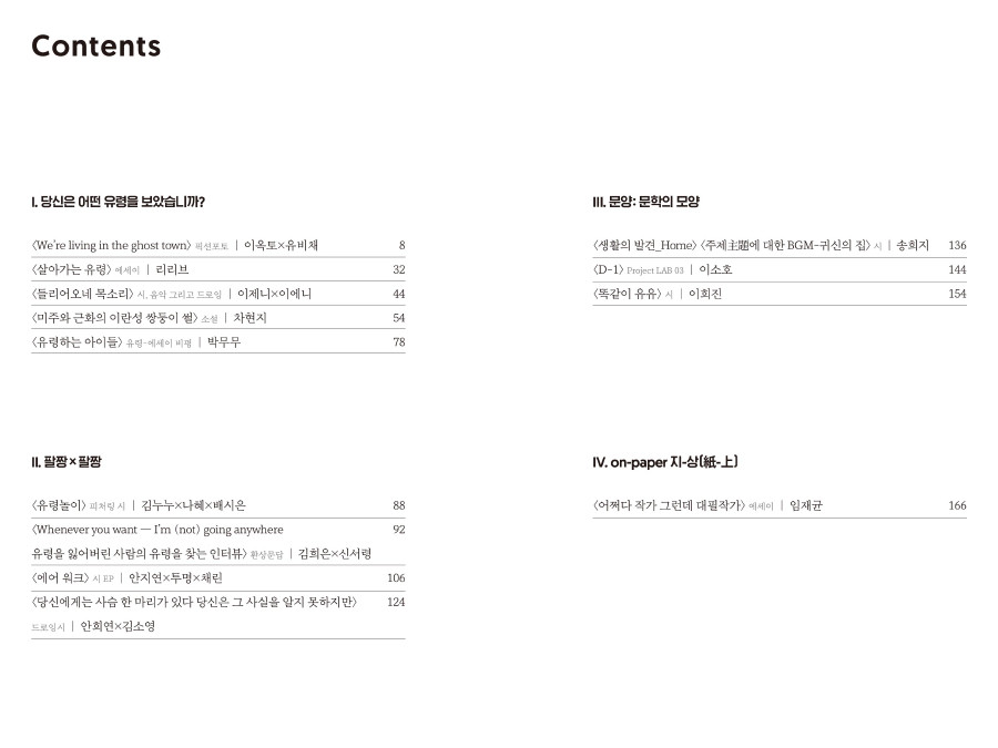 <TOYBOX> VOL.3 '유령'은 문학을 비롯한 다양한 분야의 예술가들이 함께 기록한 유령의 생활기록부입니다. 21명의 작가분들이 각자의 유령을 포착해주셨습니다. 유령을 객체와 대상이 아닌 삶과 생활의 주체로 대하며 서늘하지만 따뜻한 시선을 보내주셨습니다. 그들의 이야기는 과연 어떤 모습일까요?