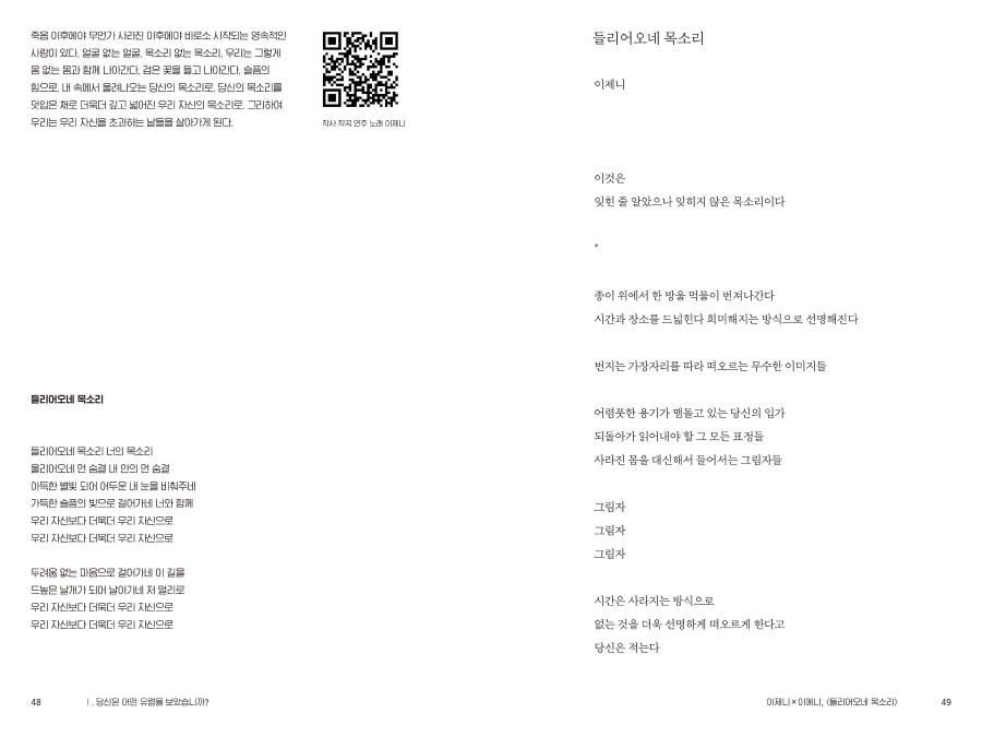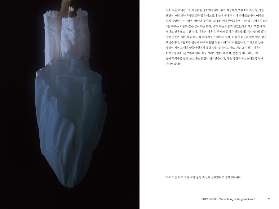 문학이 바라보는 곳은 어디일까요? 문학의 노력이 가장 보이지 않는 곳을 끝끝내 바라보려는 노력이라면, 그곳에 유령이 있을 것만 같습니다. 유령은 있을까요, 없을까요? 보일까요, 보이지 않을까요? 유령은 삶일까요, 죽음일까요? 유령을 보기 위해서 불확실을 보아야 했습니다. 부재를 보아야 했습니다. 죽음과 경계를 보아야 했습니다. 보이지 않는 역에 비가시의 딱지를 붙이는 대신 빈틈을 관찰하고 어둠을 오래 바라봐야 했습니다. 눈을 감고 바라보고 피부로 바라보았습니다. 그러자 유령의 순간은 문학의 순간과 닮아 있습니다.