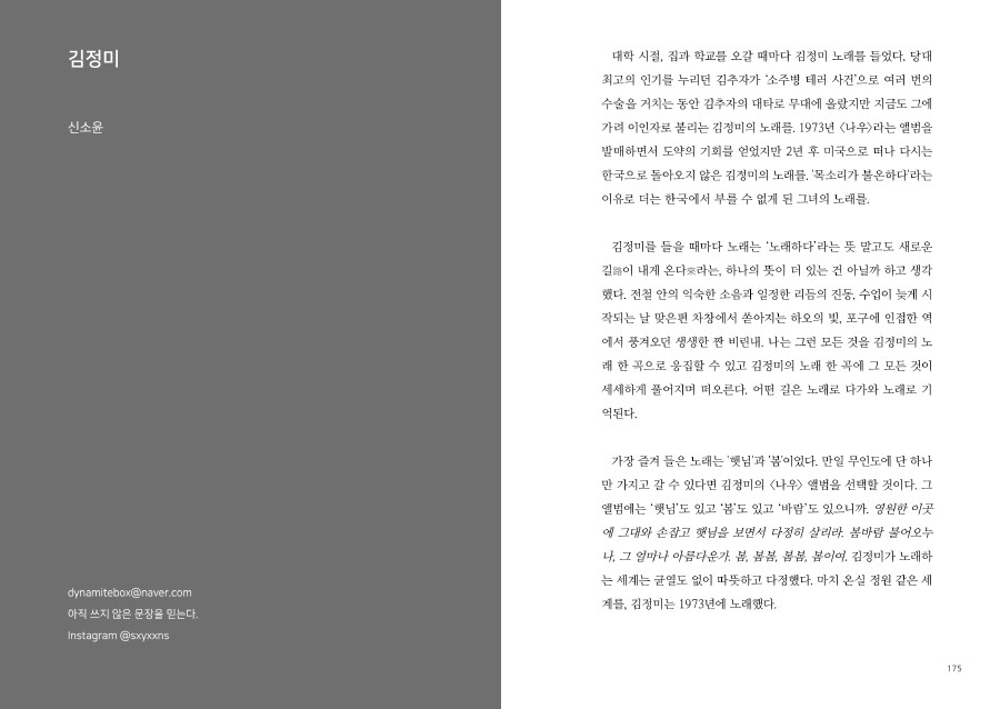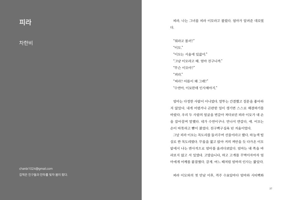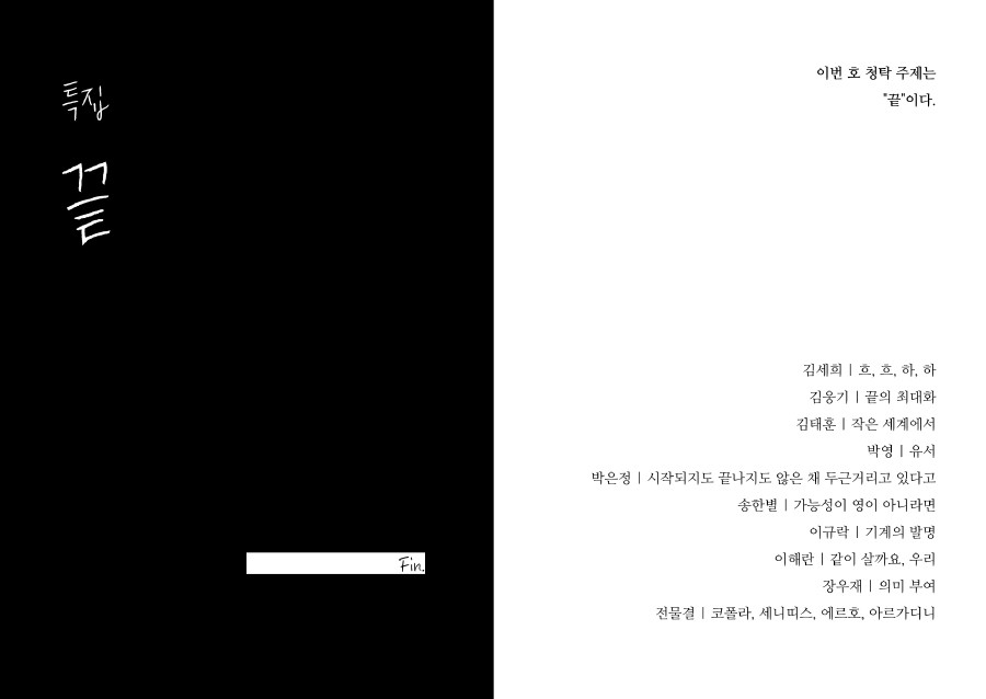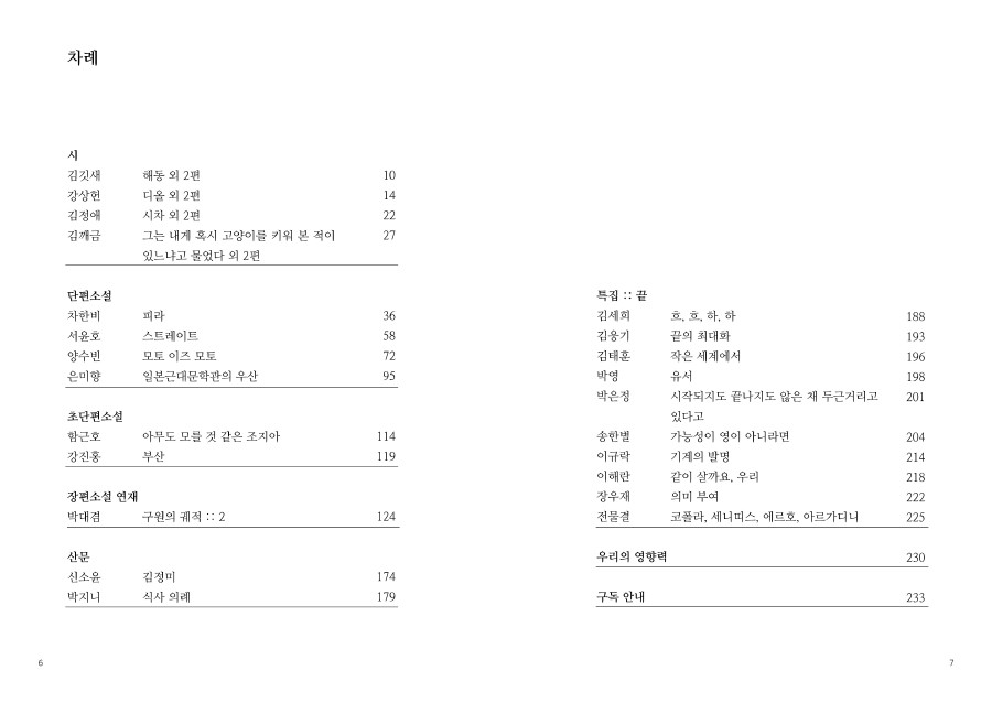 두 명의 작가가 쓴 산문 두 편, 영향력에 투고로 글을 실어온 작가들에게 청탁해 받은 글을 싣는 후반부에는, "끝"라는 주제로 풀어낸 열 편의 작품이 실립니다.
