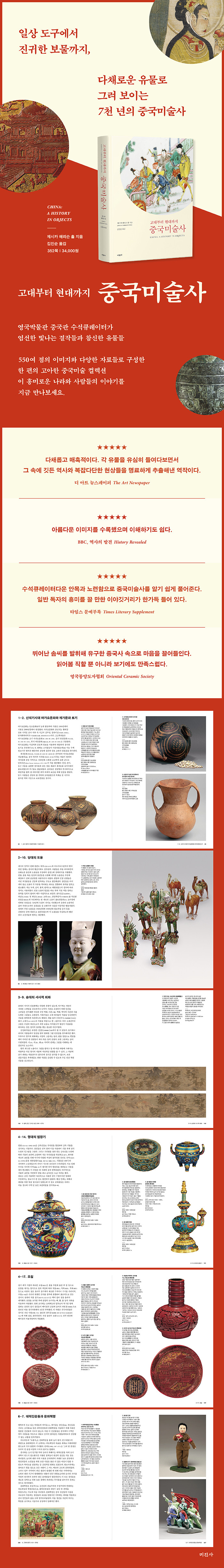 『중국미술사: 고대부터 현대까지(China: A History in Objects)』는 영국박물관 중국관 수석큐레이터인 저자가 엄선한 미술사의 걸작들과 각종 유물들을 중심으로 7천여 년의 중국미술사를 명쾌하게 읽어주는 책이다. 진시황릉의 병마용, 명·청 도자의 걸작들, 빛나는 회화 작품을 비롯해 흔히 볼 수 없었던 법랑, 칠기, 옥기와 장신구들, 조각상, 서예와 자수 작품, 근현대 판화와 펜화까지 모두 한데 모았다. 총 550여 점의 다양한 컬러 이미지를 수록해 중국 미술과 문화의 흐름을 선명하게 그려볼 수 있다.