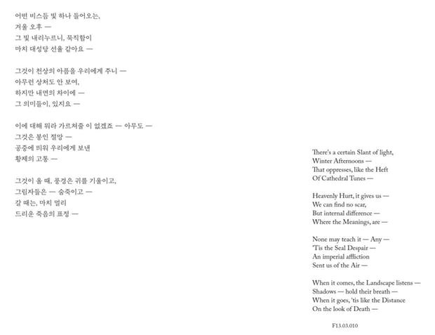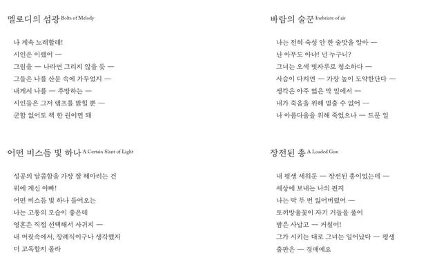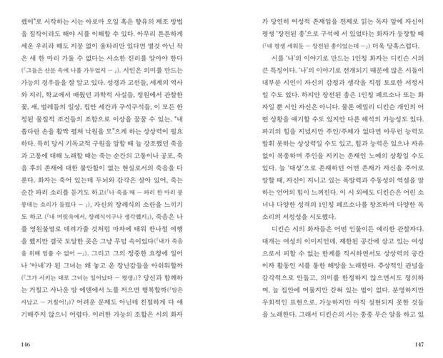 40여 편씩 시를 필사하고 편집한 손제본 형태의 파시클fascicle 40권에 보관했고, 더러는 편지봉투를 뜯어 그 안에 적어두기도 했다. 주변의 일상과 자연을 시에 담아 사랑, 죽음, 상실, 영원함, 아름다움, 글쓰기의 읽기와 즐거움을 노래한 시인은 다시 청교도의 엄숙함이나 가부장적 질서, 물질주의 생활양식에 휘둘리지 않고 자신의 리듬과 형식 속에서 세상을 바라보고 사유했다.