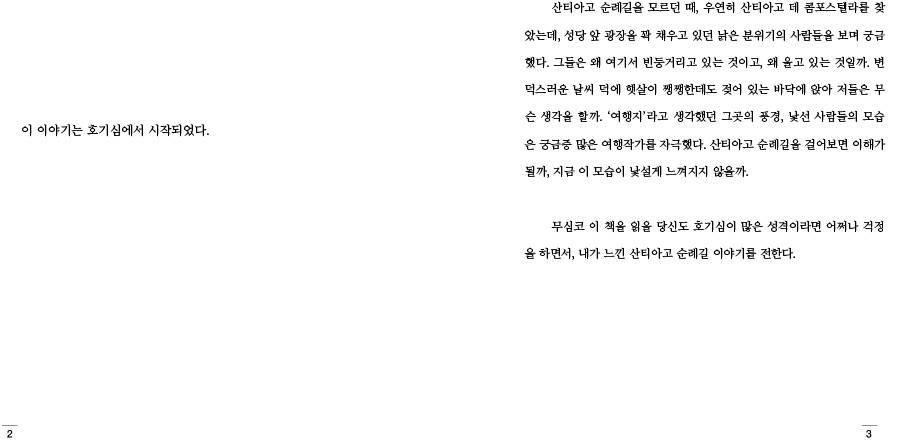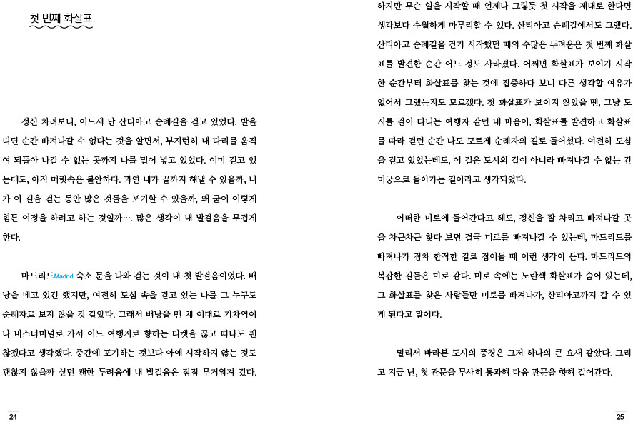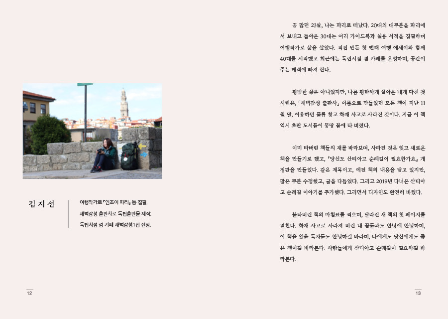 불타버린 책의 마침표를 찍으며, 달라진 새 책의 첫 페이지를 펼친다. 화재 사고로 사라져 버린 내 꿈들과도 안녕에 안녕하며, 이 책을 읽을 독자들도 안녕하길 바라며, 나에게도 당신에게도 좋은 책이길 바라본다. 사람들에게 산티아고 순례길이 필요하길 바라본다.