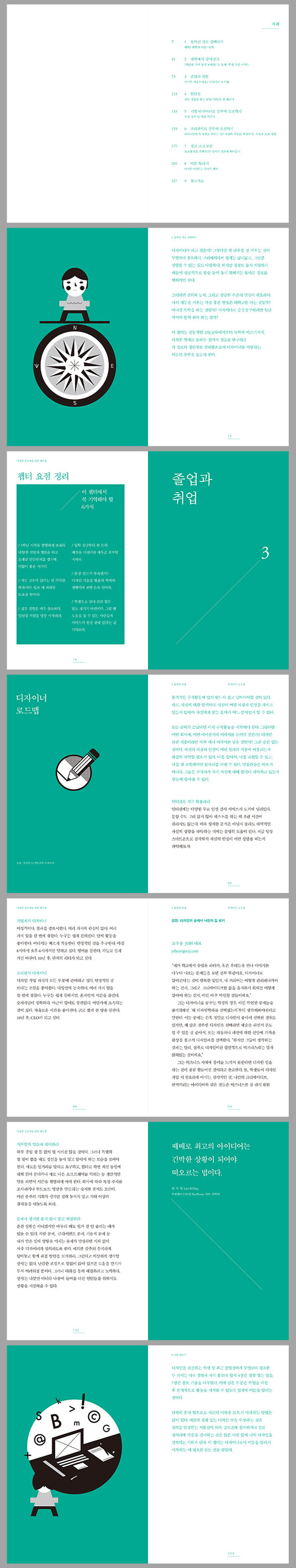 이 책에는 디자인을 공부하기 위해서 대학을 가야 하는지의 문제에서부터 시작해, 포트폴리오 준비, 인턴십 과정, 기업 디자이너, 혹은 프리랜서 디자이너로 성장하는 방법에 이르기까지. 제목 그대로 ‘디자이너가 되는 방법’을 제시해준다.