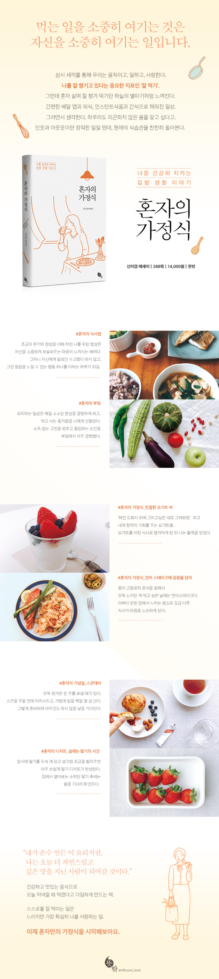 일상의 좋은 루틴을 모아 많은 독자들의 공감과 사랑을 받은 신미경 작가의 『뿌리가 튼튼한 사람이 되고 싶어』의 ‘잘 먹기’ 실천편, 『혼자의 가정식』이 새롭게 출간됐다. 이번에는 ‘혼자 잘 먹는’ 이야기다. 삶의 수준을 조금씩 올리게 한 식사법, 장을 보고 부엌을 관리하며 자신과 주변의 여러 사람을 기억하고 살피는 아주 사적인 일상, 요리를 통해 살아가는 데 이로운 여러 삶의 태도를 함께 배워나가는 그녀만의 담백한 집밥 생활 이야기가 담겨 있다.