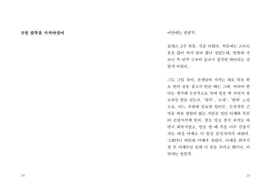 근력은 1도 없었고 마른 몸 만들기에 평생을 바친 (물론 뜻대로 되지도 않은) 30대 여성이 폴댄스를 하면서 '기능하는 몸'를 재발견한 과정을 그린 에세이입니다.