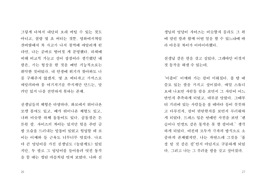 가느다란 팔만이 유일하게 몸에서 봐줄만 하다고 생각하던 시절, 우연히 폴댄스를 접했습니다. 영화에서처럼 절벽에 매달릴 경우, 내 얇은 팔은 나를 살려주지 않을 거라는 걸 깨닫고 이후 1년 반동안 봉을 타고 있습니다.