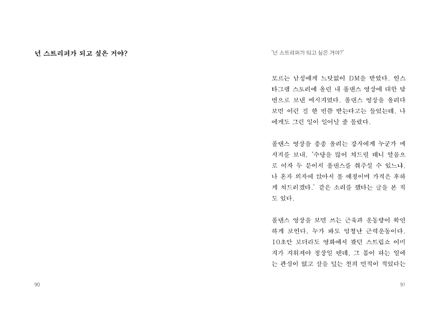 폴댄스를 등록한 첫날부터, 오랜 여정 동안에 폴 매달렸니 씨에게 일어난 변화를 생생히 들을 수 있습니다. 안타깝지만 “폴댄스킹이 되어서 라스베가스를 뒤집어놓으셨다!” 같은 결말은 아닙니다. 폴 씨는 아직도 운동쪼렙 답게 느릿느릿하게 봉을 잡고 분투중이거든요. 하지만 그 과정에서 더이상 내 몸을 부정하지도, 식이조절을 하지도, 활력 없이 살지도 않게 되었습니다.