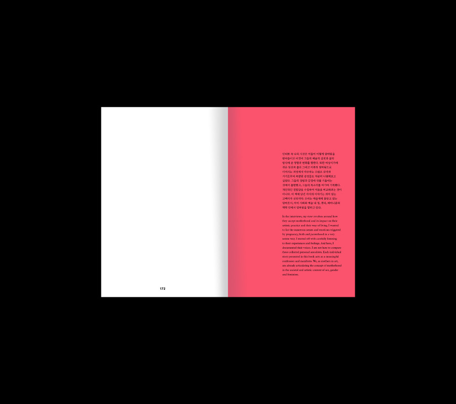 ‘어머니인 상태 - 마더후드(Motherhood)’를 주제로 시각 예술분야에서 활발히 활동하고 있는 엄마이자 예술가들의 인터뷰와 그들의 에세이를 이 책에 기록했다. 다양하고 많은 정체성의 카테고리 중 ‘엄마’는 예술 또는 예술계 내에서 어떻게 인식되는지, 예술가라는 주체적 삶 속에서 ‘엄마’라는 또 다른 아이덴티티를 가진 이들의 작업을 통해 마더후드, 즉 ‘엄마됨’ 어떻게 그들의 작업 과정 또는 예술적 결과물과 관계를 맺거나 혹은 거리를 두는지 조명하고 있다.