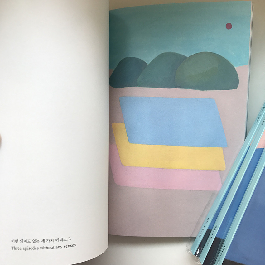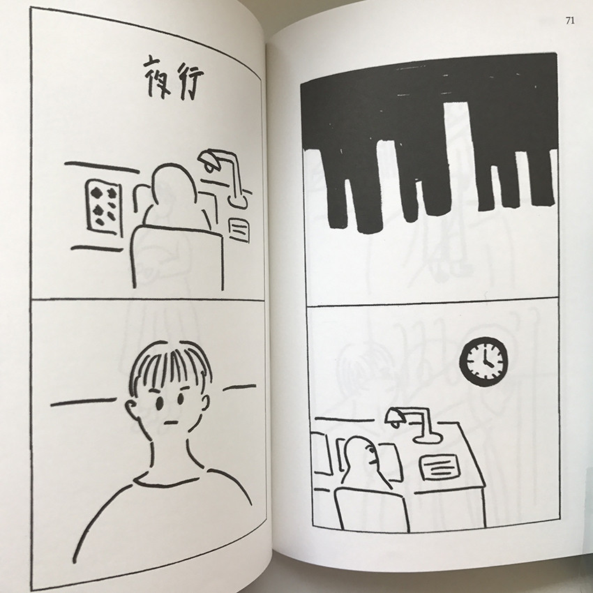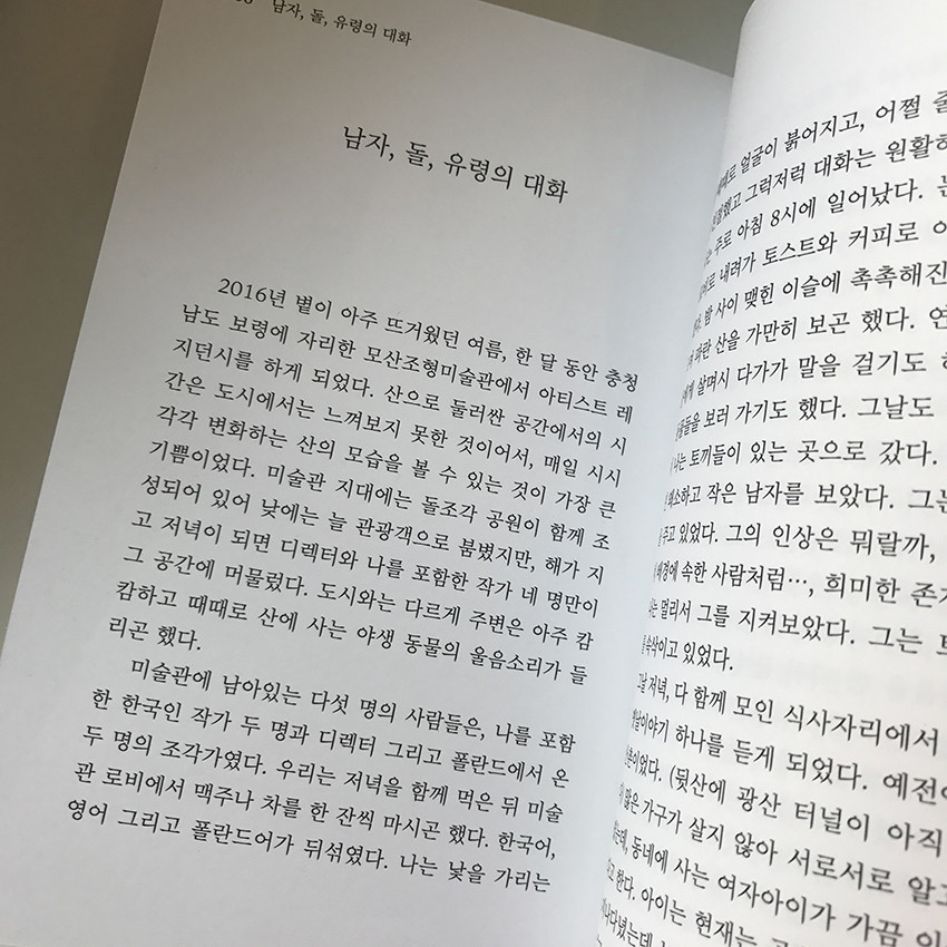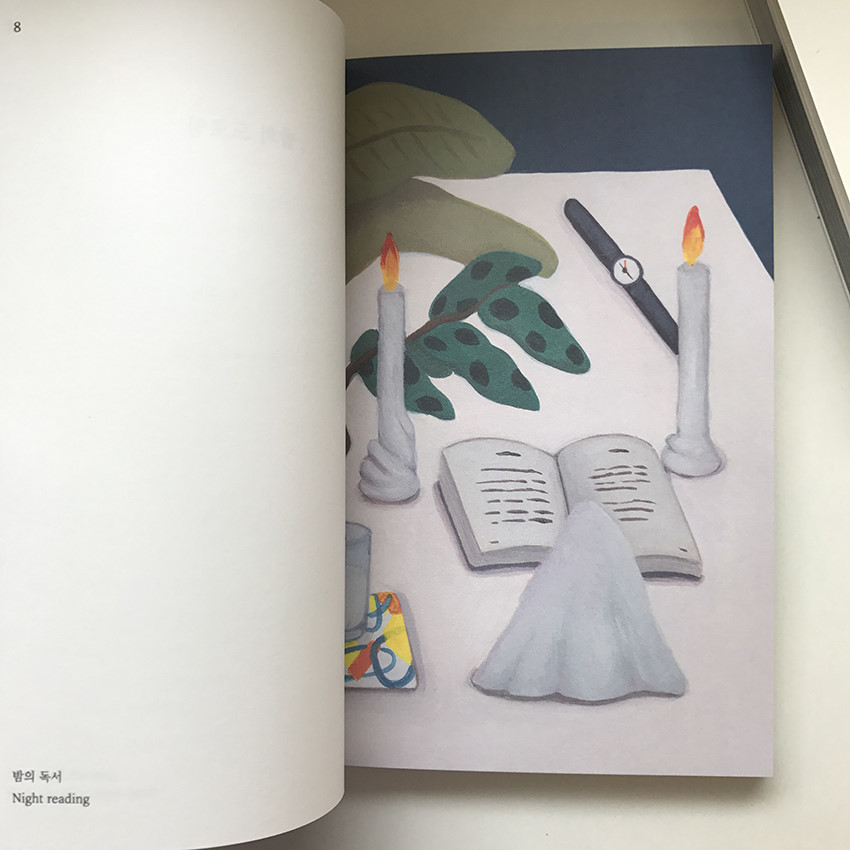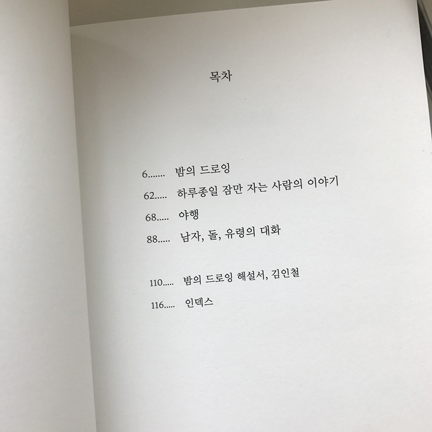 총 네개의 목차로 구성되어 있는데, <밤의 드로잉>이란 제목으로 묶여있는 드로잉들과 그것에 조금 더 상상력을 불러 일으켜줄수 있는 초단편소설 <하루종일 잠만 자는 사람의 이야기> 그리고 컷만화 <야행>, 기묘한 경험을 바탕으로 작업한 <남자, 돌, 유령의 대화>로 구성되어져 있습니다.