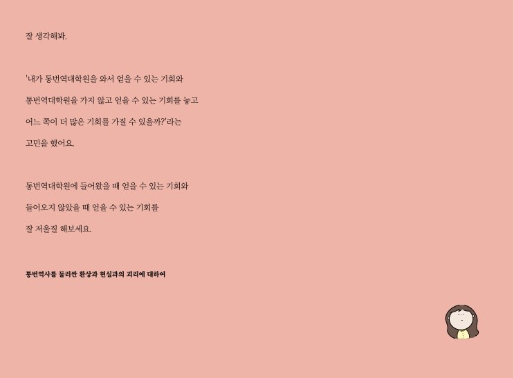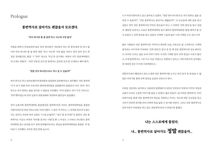 언어 하나로 먹고살아보고자 화려함과 당당함의 끝판왕이라고 생각했던 ‘전문 통번역사’가 되기 위해 통번역대학원을 졸업했지만 졸업하자마자 ‘언어’ 하나만으로 내가 원하는 삶을 살아갈 수 없음을 직감했다.