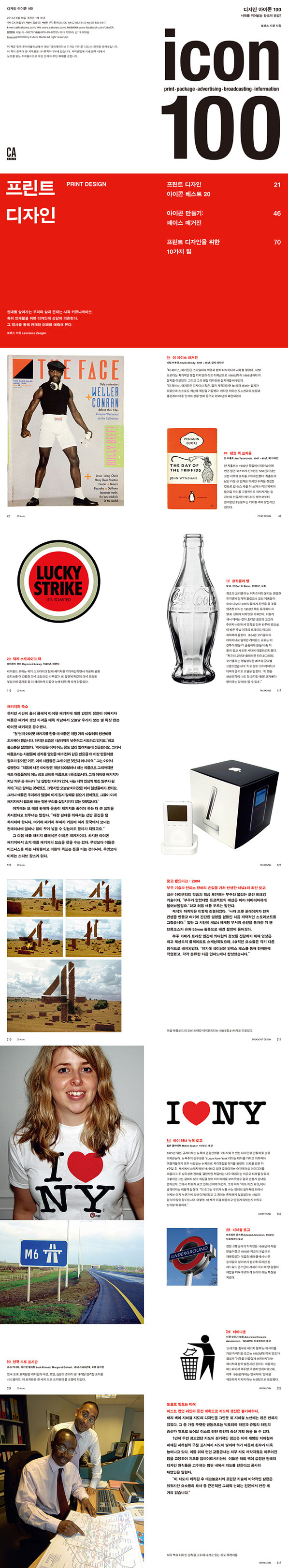 『디자인 아이콘 100』에는 프린트, 패키지, 방송, 광고, 정보 등 5개 그래픽 디자인 분야에서 시대를 초월하는 디자인 아이콘들을 각각 20개씩 모두 100 가지를 엄선하여 담았습니다. 또한 각 분야별로 대표적인 아이콘을 하나씩 뽑아 그 제작 과정에서부터 숨겨진 이야기를 담았고, 각 분야 전문가들이 들려주는 좋은 디자인을 위해 꼭 필요한 유용한 팁 10 가지씩을 각각 모았습니다.