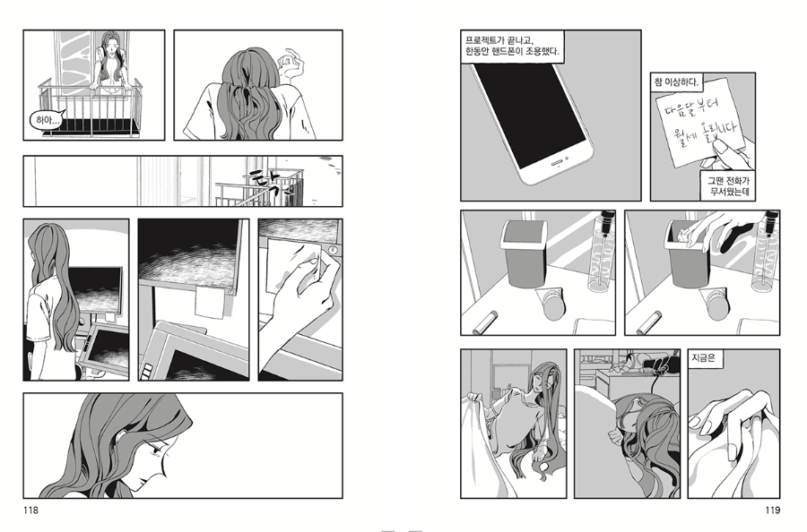 만화작가인 은영. 혼자 사는 그의 방은 자신에게 완벽한 우주였다. 일과 삶, 생존을 위한 모든 것이 오로지 그를 위해 구성되어 있었다. 전화공포증이 있는 은영은, 이전 담당자와 달리 문자가 아닌 전화로서 업무를 처리하려 하는 새로운 담당자로부터 두려움을 느낀다. 2030 청년의 이슈 ‘보편적인 사회성’에 대한 고민, 외부의 소음과 내부의 적막 간 괴리감을 느끼는 1인가구의 모습이 드러난다.