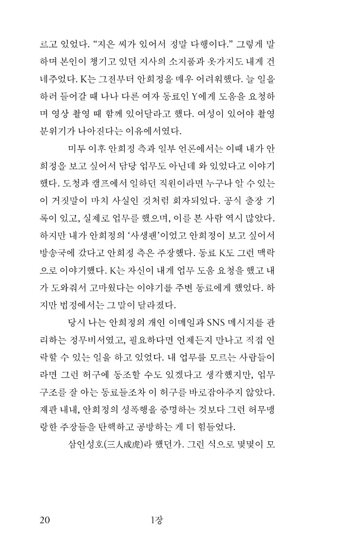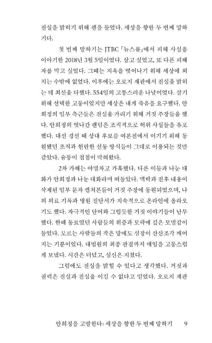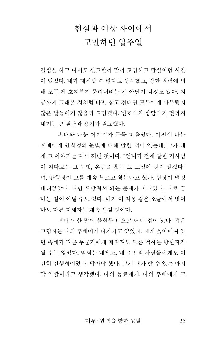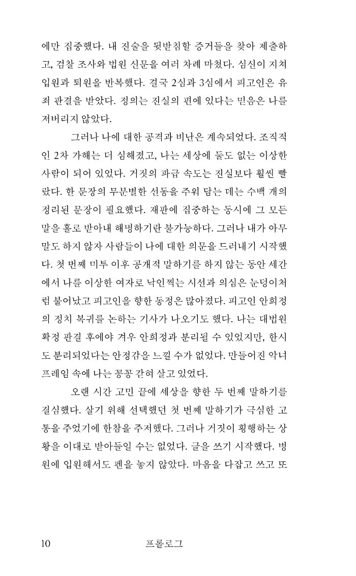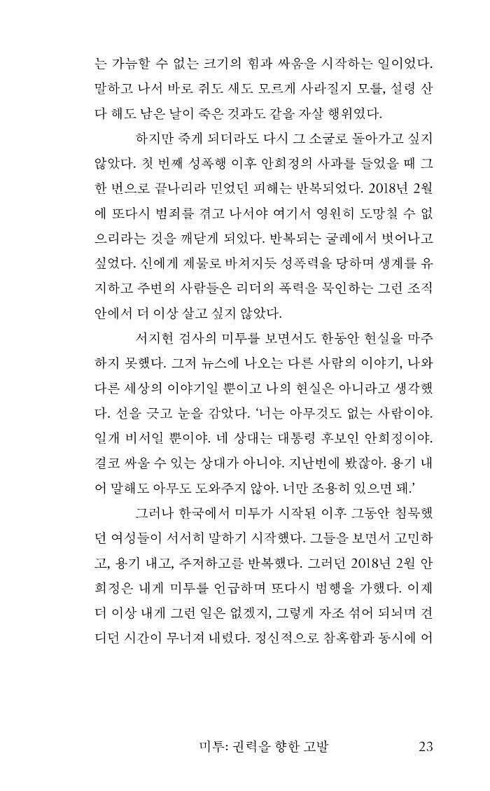 김지은은 다음 피해자를 막기 위해 미투를 결심했다고 한다. 그러나 이후 오랫동안 그는 세상을 향해 말할 기회를 얻지 못했고, 수많은 거짓 선동 속에 숨죽여야 했다. 재판에 매진하며 위력 속에 갇혀 있었던 이 목소리가 널리 읽히고 기억되는 것이, 지금도 무수히 존재하는 위력 속 가해와 피해를 멈추는 길이며 곧 정의라고 믿는다.