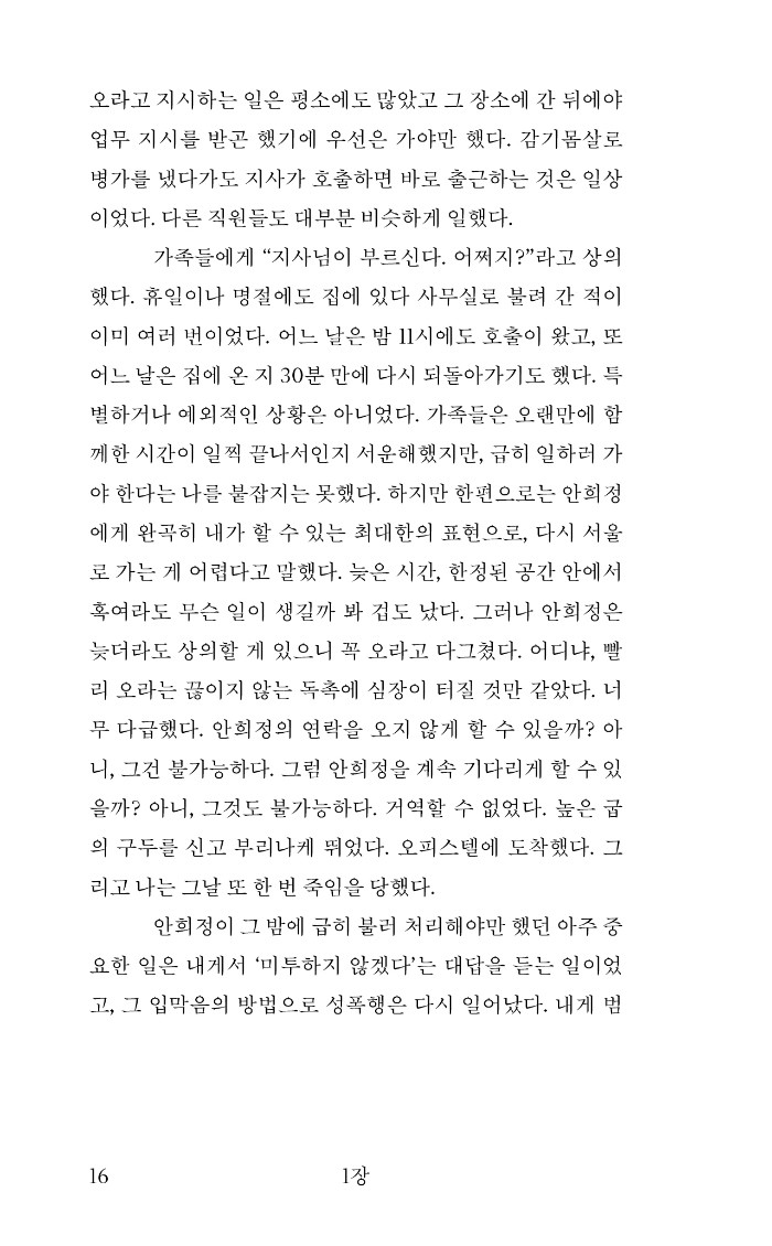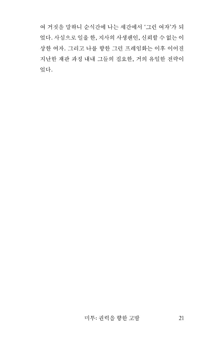책은 상사로부터 위력에 의한 성범죄를 당한 노동자 김지은, 그리고 마침내 그 권력과의 싸움을 결심하고 완수해낸 피해 생존자 김지은의 기록이다. 재판을 위해 필요한 증거를 거듭 정리해 제출하고 반복해 진술하며 수개월을 보내온 그다. 더하고 뺄 것 없는 진실이 여기에 있다. 증거 자료와 모든 신빙성의 격차에도 불구하고 왜 1심 무죄가 가능했는지, 위력 성범죄를 바로잡기 위한 재판이 이토록 힘겨울 일이었는지, 무엇이 애초에 이 같은 폭력을 가능하게 했으며 왜 그것을 바로잡아야 하는지. 수많은 질문과 답을 던지는 이 책은 지독한 불의 속에서 끝끝내 올바름을 찾는 힘겨운 싸움의 증언이다.