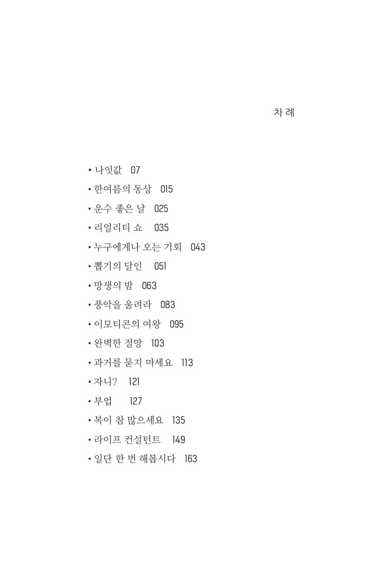 지금과는 다른 인생을 꿈꾸는 이들의 눈물겨우면서도 우스꽝스럽기까지 한 처절한 시도들을 모은 단편집이다.