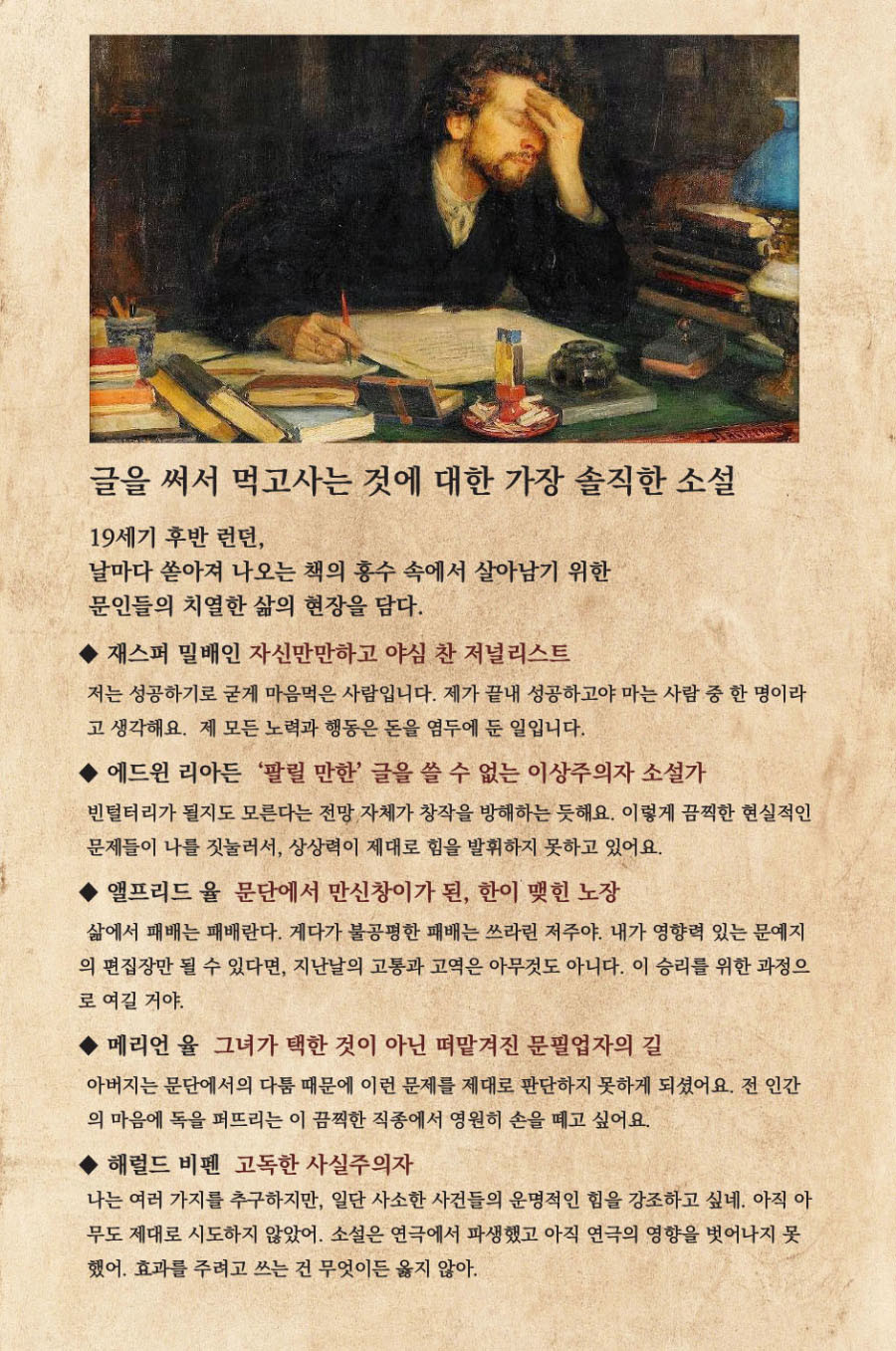 이 소설에는 사람들이 흔히 생각하는 작가의 모습은 없다. 분위기 있는 카페에 앉아서 압생트를 들이켜며 영감의 인도 아래 술술 써 내려가는 예술가 대신, 요통과 감기에 시달리고 집세를 걱정하며 하루에 정해 놓은 분량을 어떻게든 메꾸려고 아등바등하는 노동자가 있을 뿐이다.