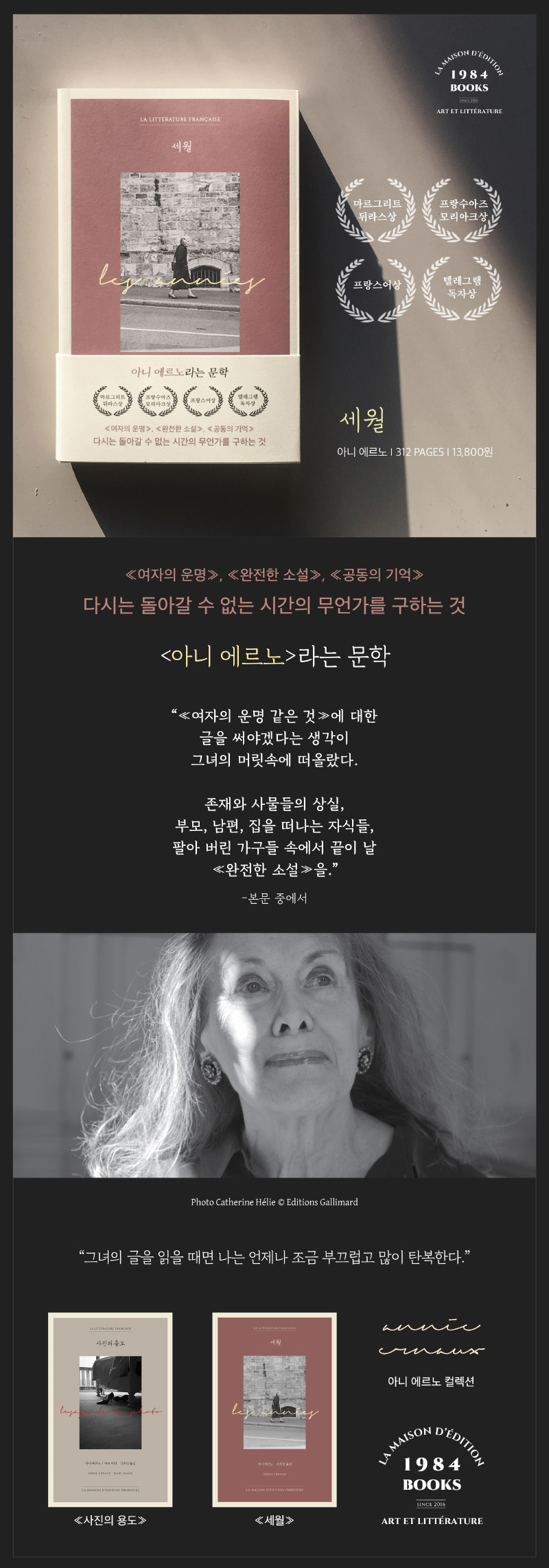 출간 직후 문학적 성취를 인정받아, <마르그리트 뒤라스상>, <프랑수아즈 모리아크상>, <프랑스어상>, <텔레그램 독자상>을 수상하며, 아니 에르노의 대표작으로 여겨지는 소설 『세월』은 1941년에서 2006년의 시간을 한 여성의 시각으로, 또 개인의 역사에 공동의 기억을 투영하여 담은 작품이다.