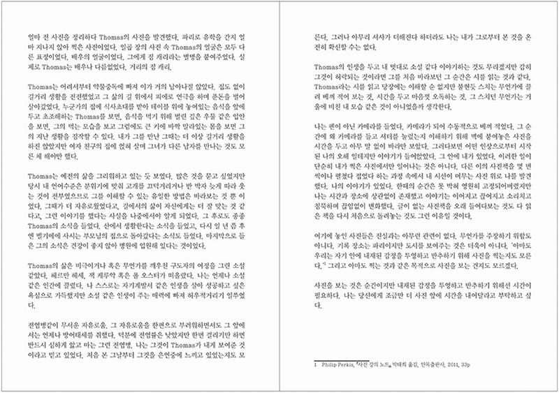 "Thomas의 인생을 두고 내 멋대로 소설 같다 이야기하는 것도 무리겠지만, 감히 그것이 허락되는 것이라면 그를 처음 바라보던 그 순간은 시를 읽는 것과 같다. Thomas라는 시를 읽고 당장에는 이해할 수 없지만 불현듯 스치는 무언가에 끌려 베껴 적어 보는 것, 시간을 두고 마음껏 오독하는 것, 그 스치던 무언가는 거울에 비친 내 모습 같은 것이 아니었을까 생각한다."