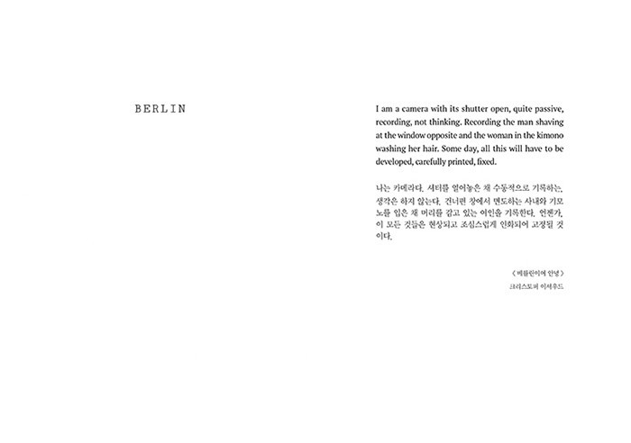 한 시절을 잘라 볼 수 있다면, 그 시작과 끝을 시간이 아닌 공간으로 이야기한다면 '파리'와 '베를린'은 제 한 시절의 시작과 끝이라고 말할 수 있습니다. 그러니 이 두 도시에 머물며 필름에 새겨놓은 흔적들은, 제 한 시절의 기록임과 동시에 기억이기도 할 것입니다. 그리고 그 기억들이 지금의 제 자신과 분리할 수 없듯이 그것은 일종의 자화상이라고도 할 수 있지 않을까요. 조금 더 '개인적인 경험의 측면'에서도 이야기를 해보고 싶습니다.