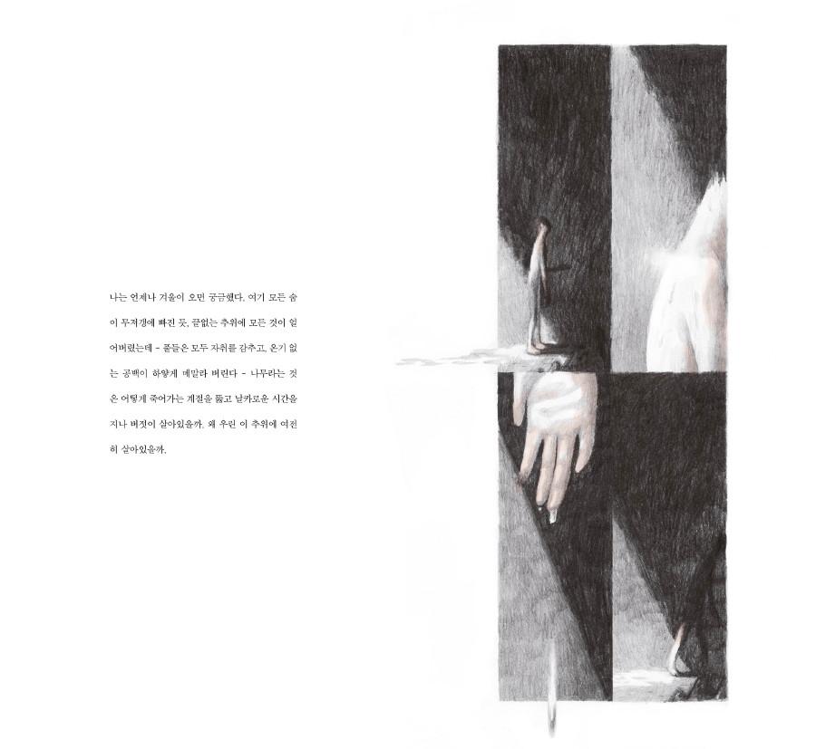 나는 언제나 겨울이 오면 궁금했다. 여기 모든 숨이 무저갱에 빠진 듯, 끝없는 추위에 모든 것이 얼어버렸는데 - 풀들은 모두 자취를 감추고, 온기 없는 공백이 하얗게 메말라 버린다 - 나무라는 것은 어떻게 죽어가는 계절을 뚫고 날카로운 시간을 지나 버젓이 살아있을까. 왜 우린 이 추위에 여전히 살아있을까.