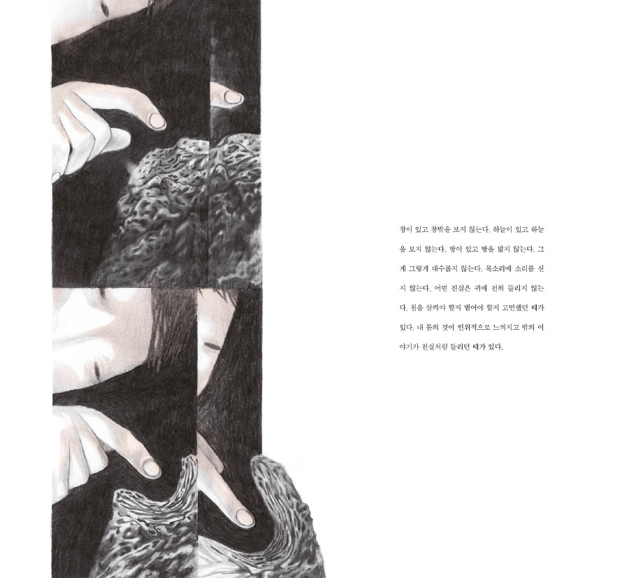창이 있고 창밖을 보지 않는다. 하늘이 있고 하늘을 보지 않는다. 땅이 있고 땅을 밟지 않는다. 그게 그렇게 대수롭지 않는다. 목소리에 소리를 싣지 않는다. 어떤 진실은 귀에 전혀 들리지 않는다. 침을 삼켜야 할지 뱉어야 할지 고민했던 때가 있다. 내 몸의 것이 인위적으로 느껴지고 밖의 이야기가 진실처럼 들리던 때가 있다.
