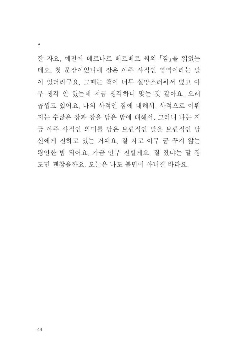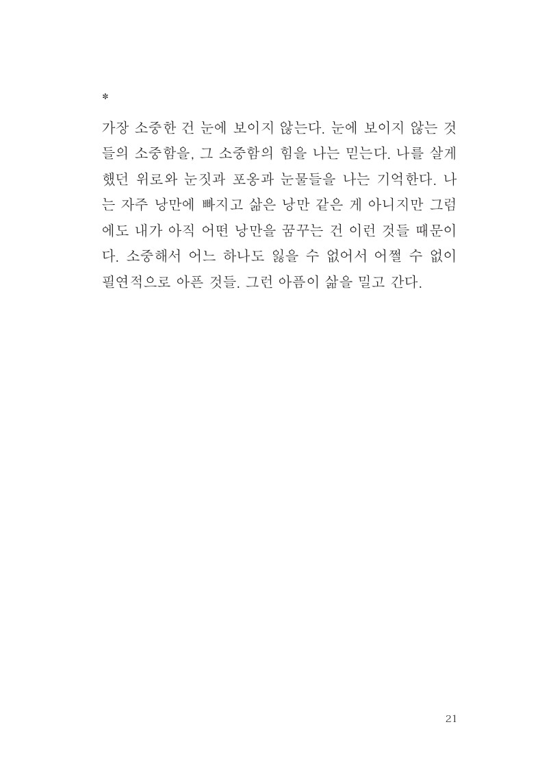 가만히 있으면 수많은 것들을 그저 잃어갈 수밖에 없는 세상에서, 잃지 않기 위해서는 자꾸만 무엇을 해야만 하는 세상에서, 마음 밑바닥에 가지고 있는 어떤 하나, 아마 각자 다 다를 그 어떤 하나를 잃지 않게 하는 글이었으면 좋겠습니다.