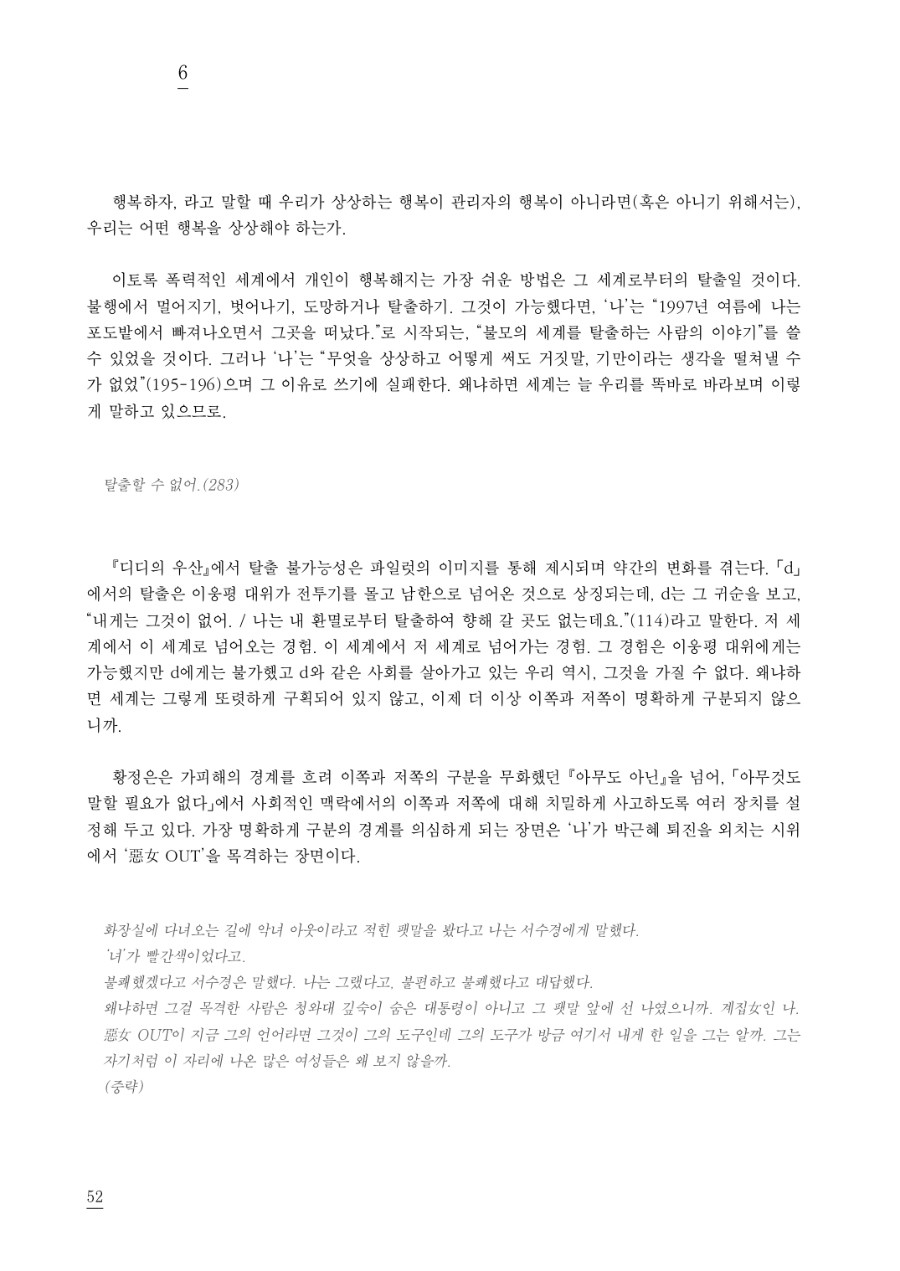 After Sentimental 2호에서는 황정은 작가의 작품들을 다루었습니다. 여러 작품을 엮은 평론이나 책을 읽고 나눈 대화, 특정한 부분에 집중하여 주관과 방향성을 가지고 작품을 읽어낸 글, 작품의 독특한 부분에 천착하여 취향을 담아낸 개인적인 글 등 다양한 감상을 실었습니다. 작품을 가볍게도, 무겁게도 통과하며 문학이 삶 속에 들어와 삶의 모양을 바꿀 수 있기를 바랐습니다.